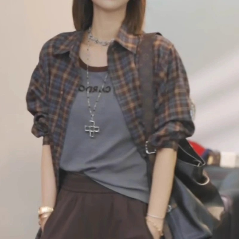 短款 阔色格子蓝衬衫 女小衫 miu系穿搭新款 上衣 荷叶边衬衣2025秋季