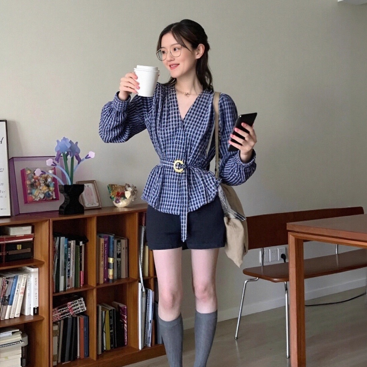 女大码 衬衫 胖mm高级收腰绑带遮肚上衣 蓝色格子长袖 2025初秋款