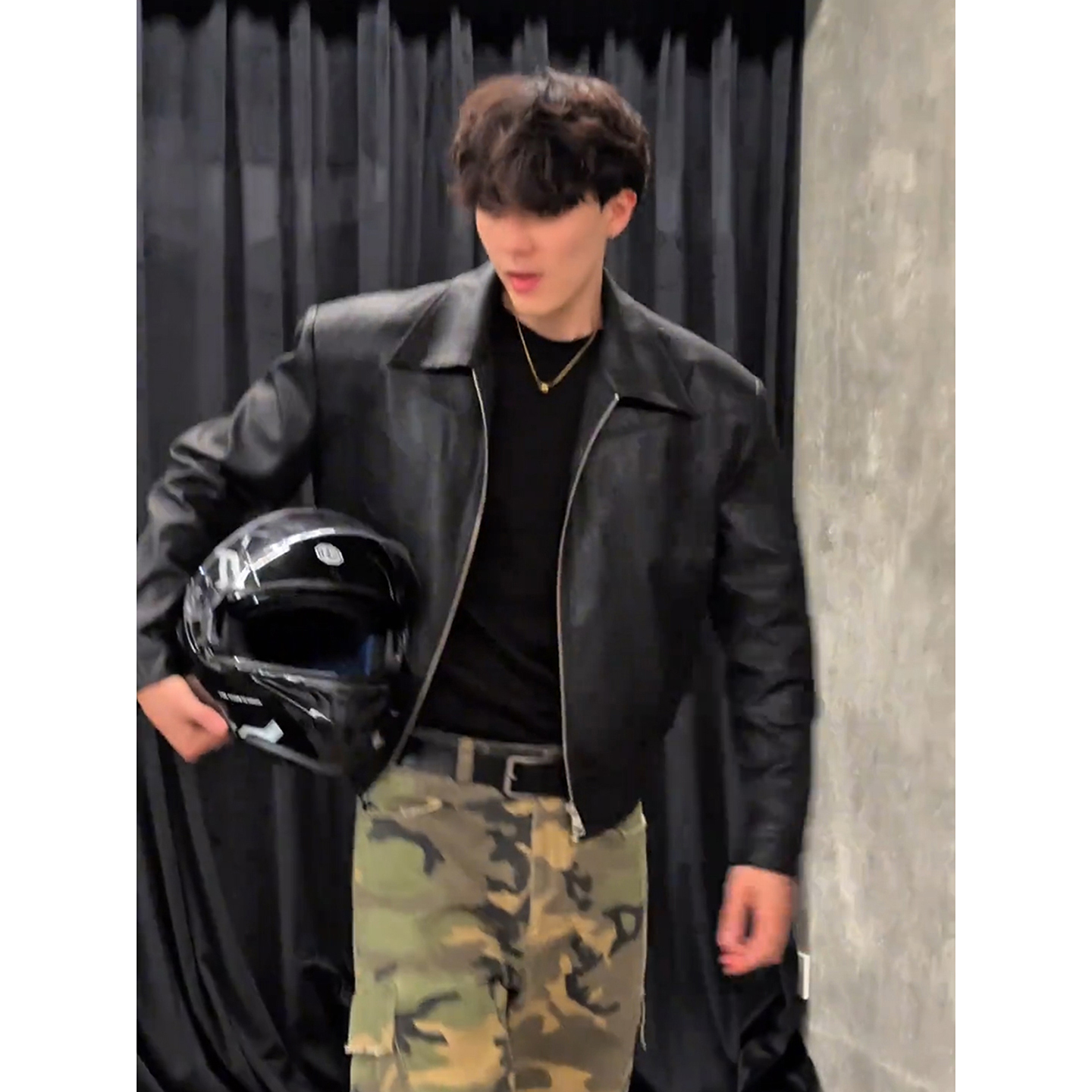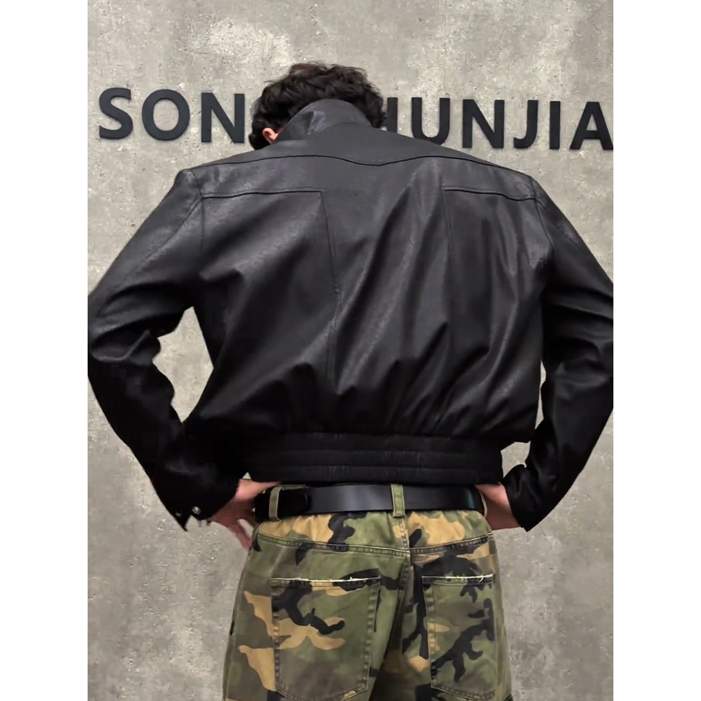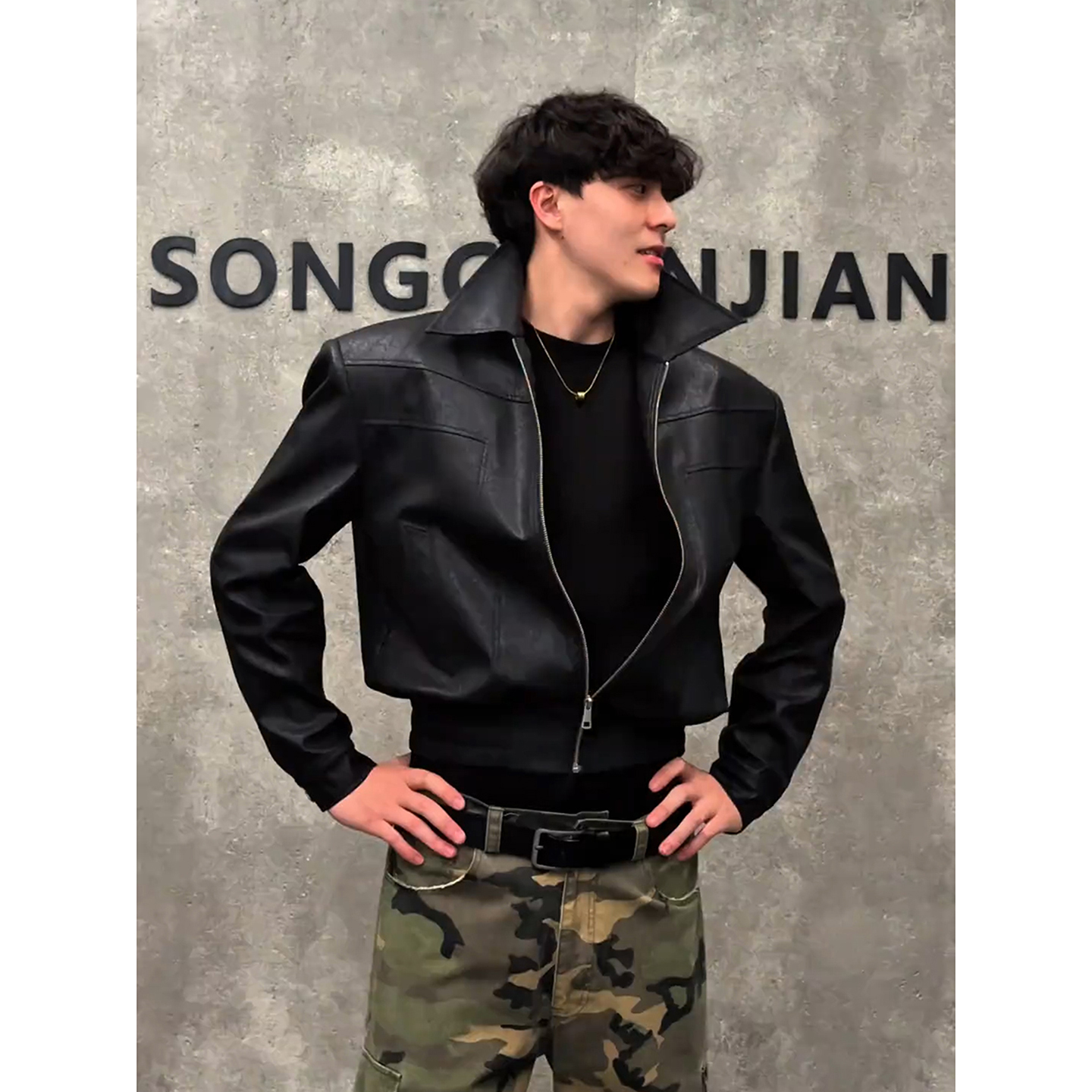 痞帅vibe红内正肩夹克高级感飞行棒球服 皮机车服美式 黑色短款 男士