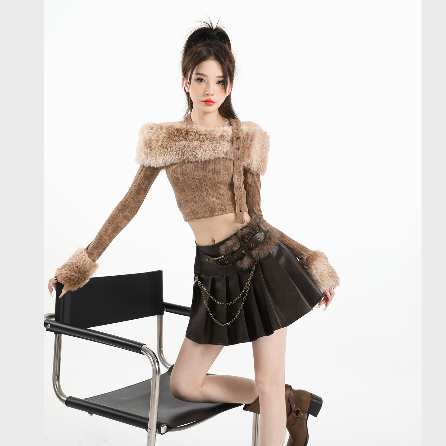 原创复古辣妹皮毛高腰拼接腰带百搭百褶半身裙防走光A字短裙女