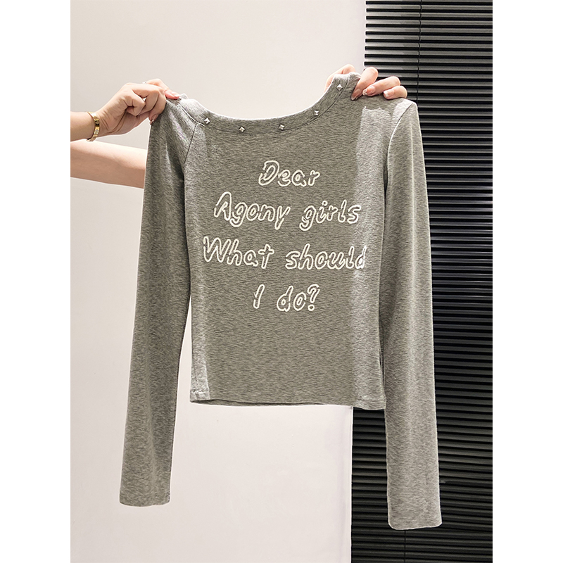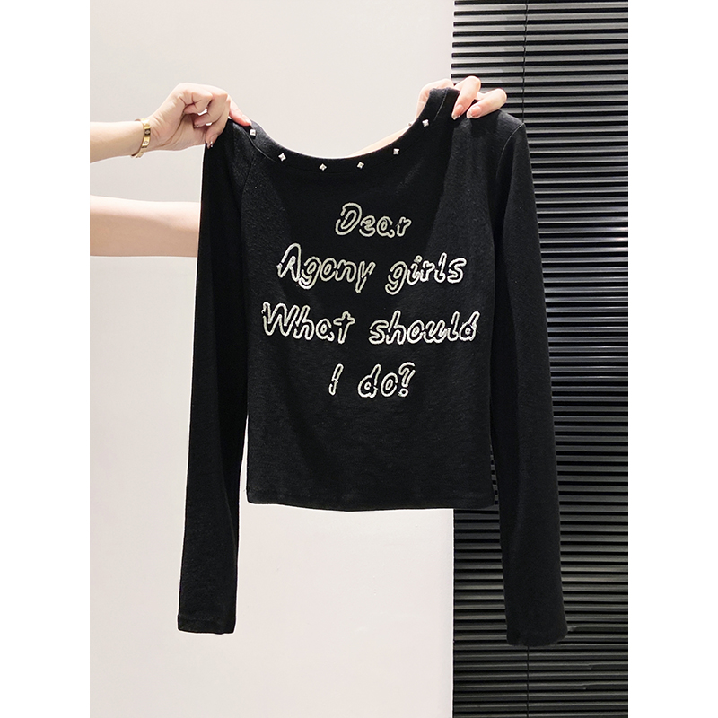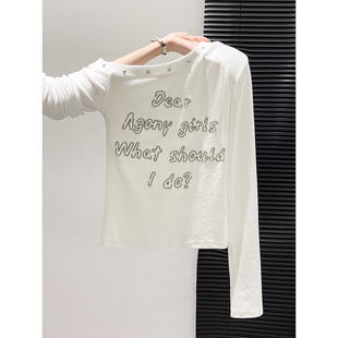 显瘦辣妹露肩短上衣 修身 白色字母印花斜领长袖 t恤女2025早秋新款