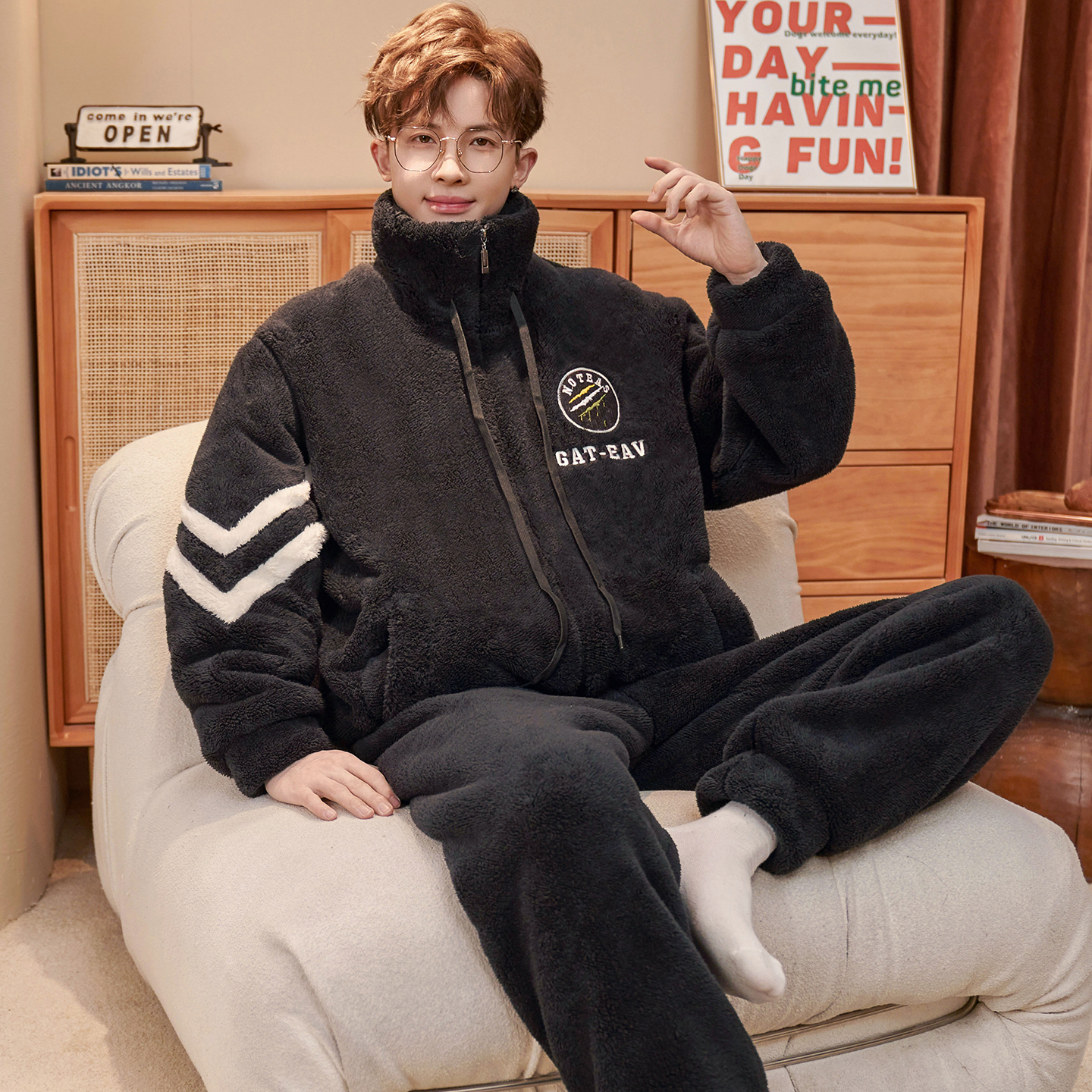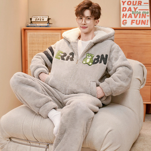 加厚珊瑚绒睡衣男士 家居服大码 秋冬季 加绒开衫 法兰绒套装 春秋新款