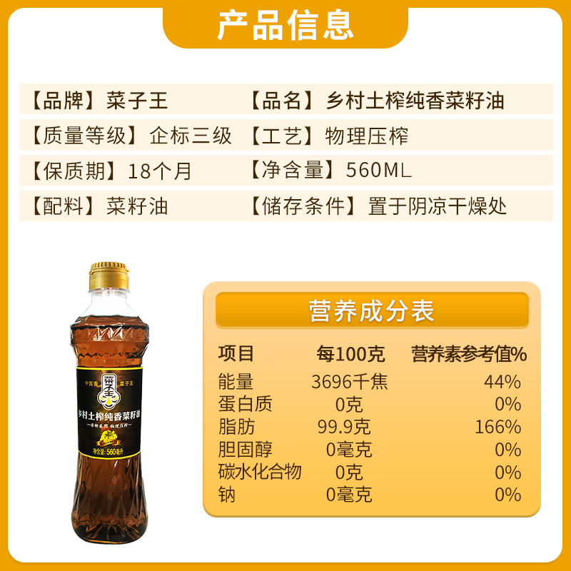 菜子王乡村土榨菜籽油560ml非转基因食用油小瓶装 菜籽油四川U先