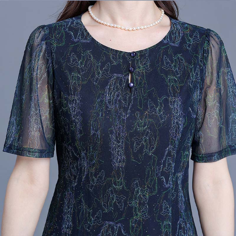a字裙 显瘦圆领中长款 埃伦优雅印花网纱连衣裙2024年夏季 收腰修身