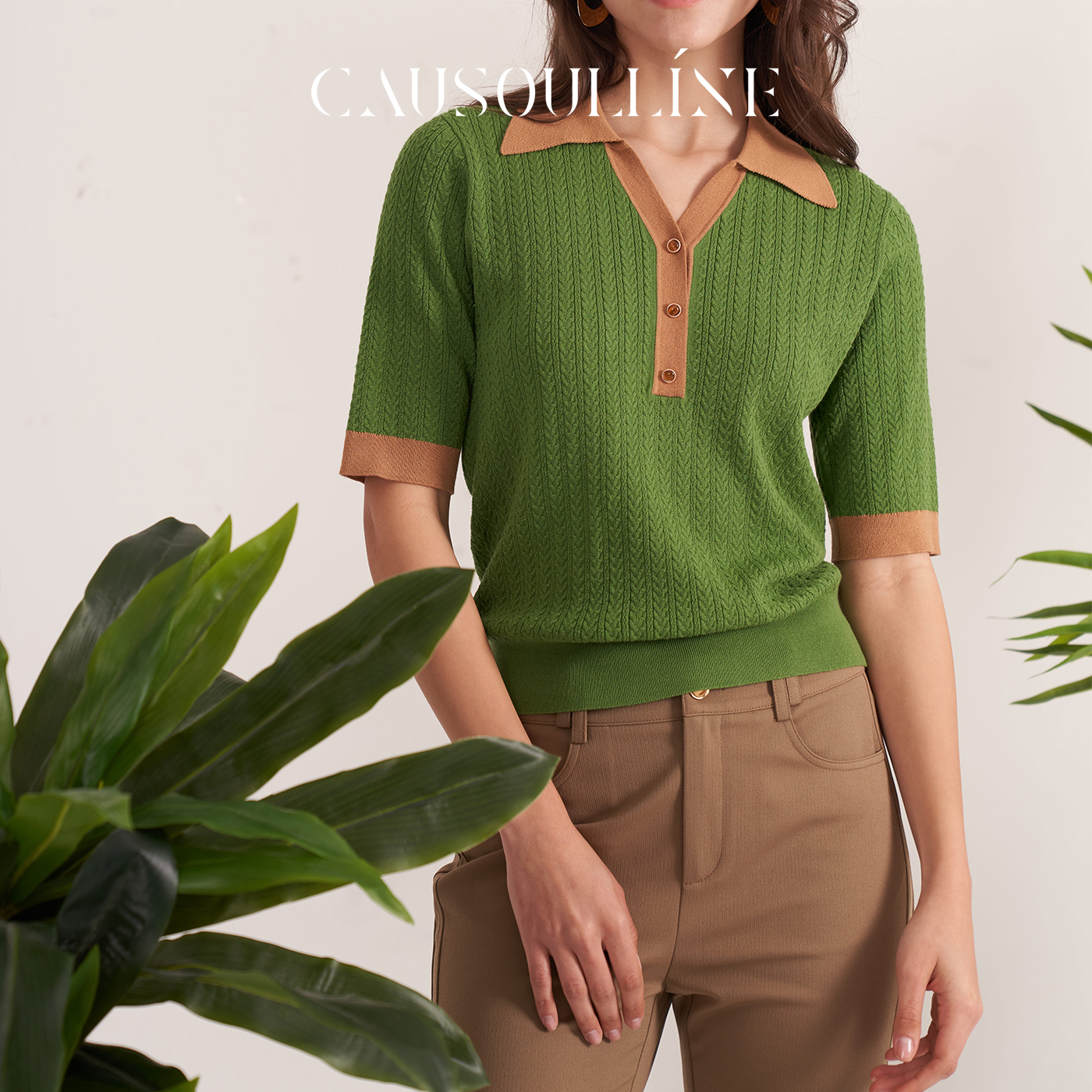 设计感POLO领毛衣短袖 休闲拼色针织衫 上衣女 新款 高斯雪岚夏季
