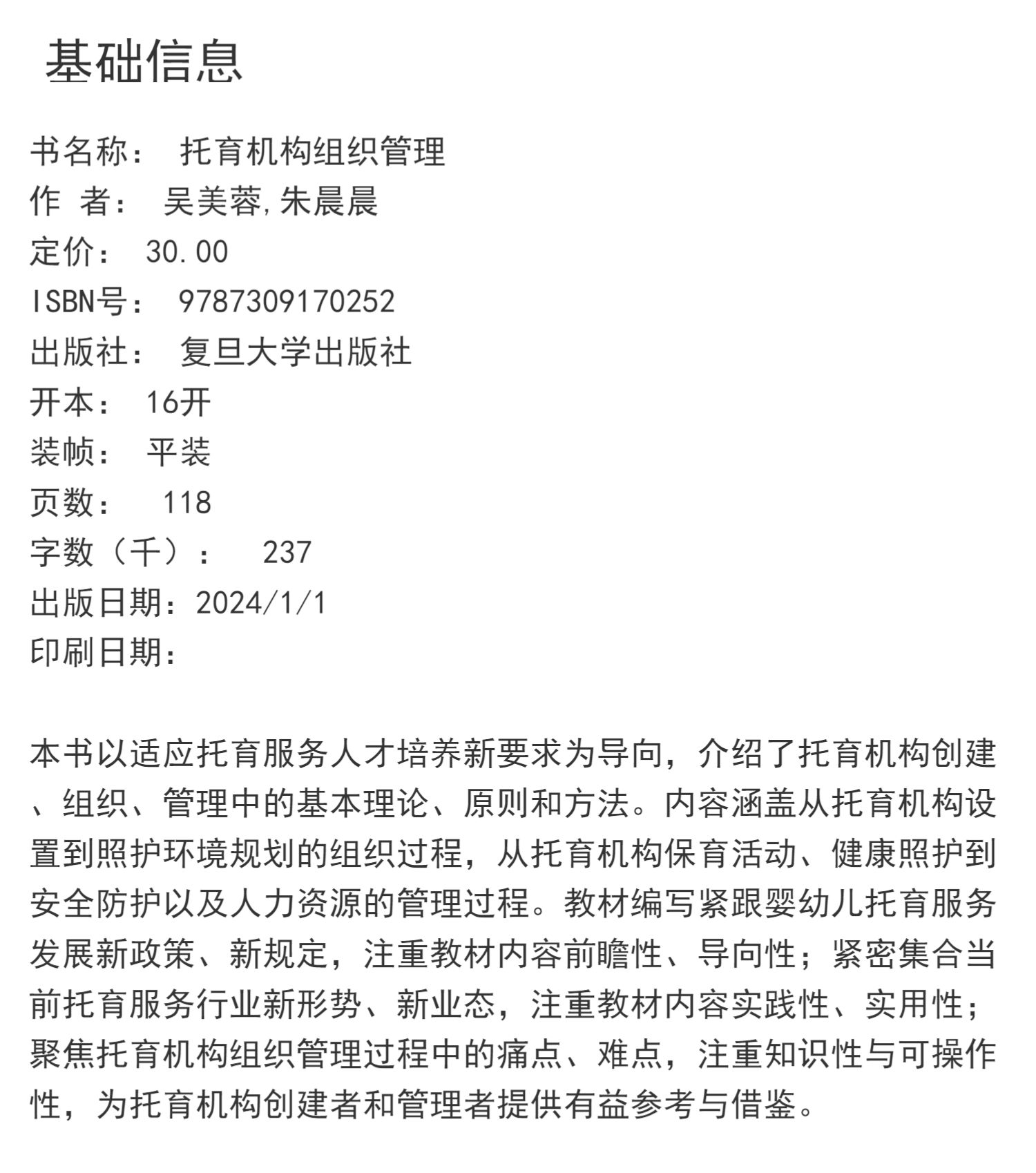 吴美蓉 托儿所组织管理教材 朱晨晨主编 社 婴幼儿托育早期教育教材 复旦大学出版 托育机构组织管理