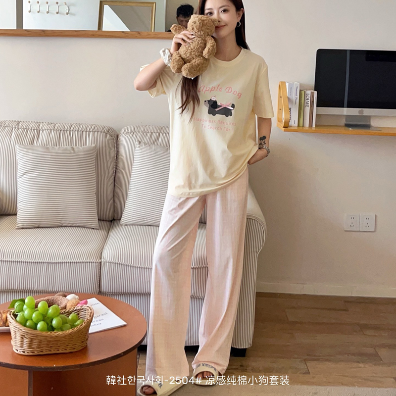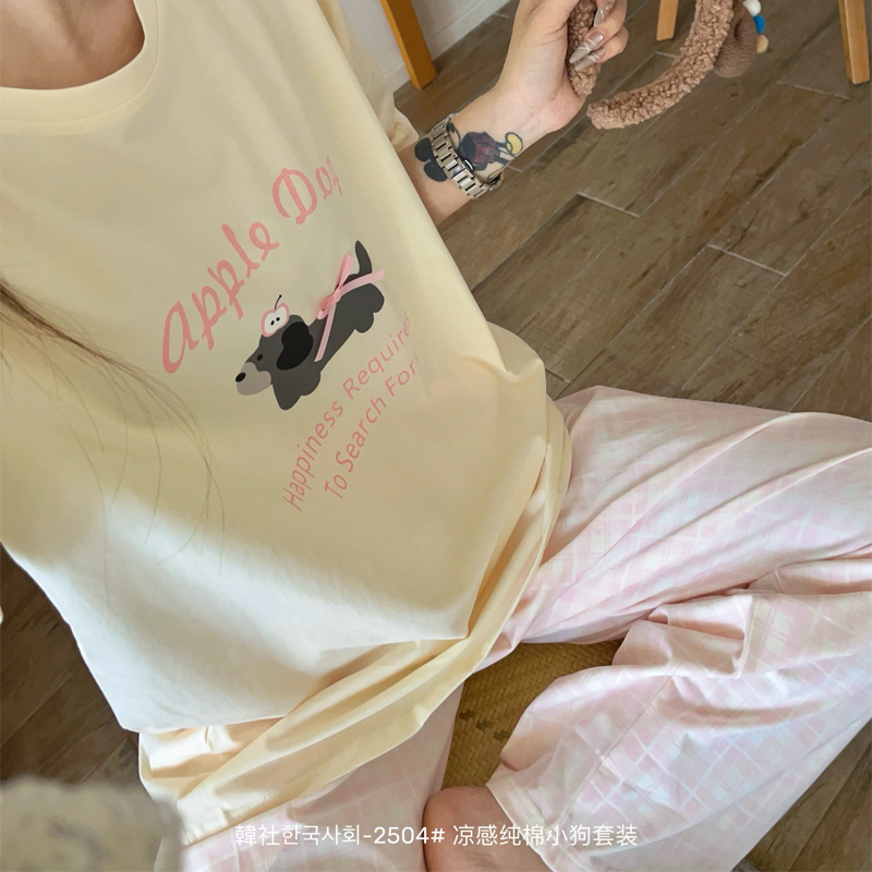 凉感棉睡衣女款 韩社凉感纯棉小狗套装 格子薄款 短袖 休闲家居服 夏季