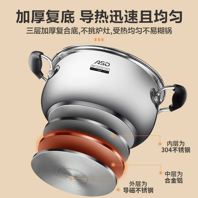 爱仕达汤锅304不锈钢加厚家用蒸锅煮粥锅煮锅蒸煮燃气电磁炉炖锅
