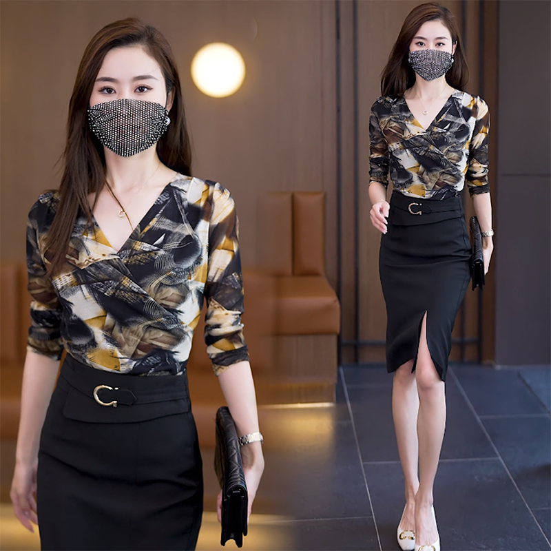 上衣洋气别致漂亮小衫 遮肚子网纱打底衫 V领气质长袖 新款 内搭秋季