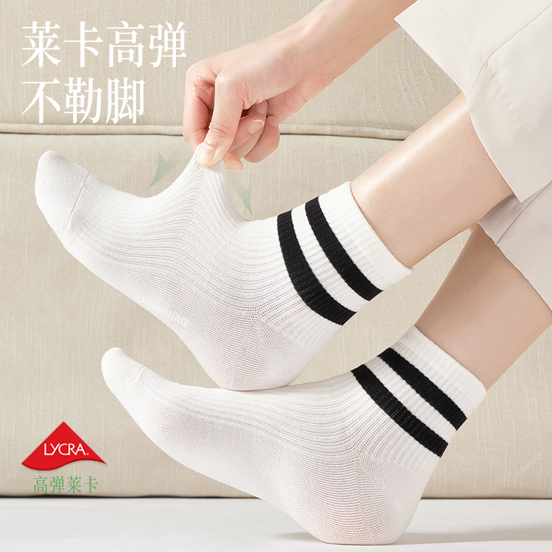 袜子女中短筒夏季 棉质网眼吸汗透气撞色条纹白色运动女士短袜 薄款