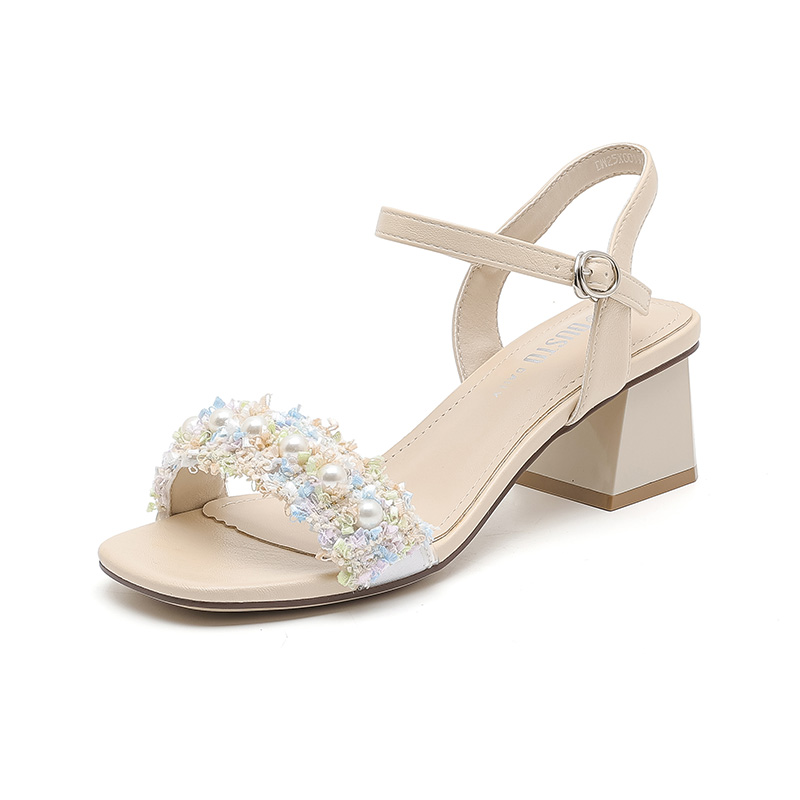 2025新款 外穿法式 时尚 大东dd一字带凉鞋 夏款 夏季 粗跟珍珠女鞋 女款
