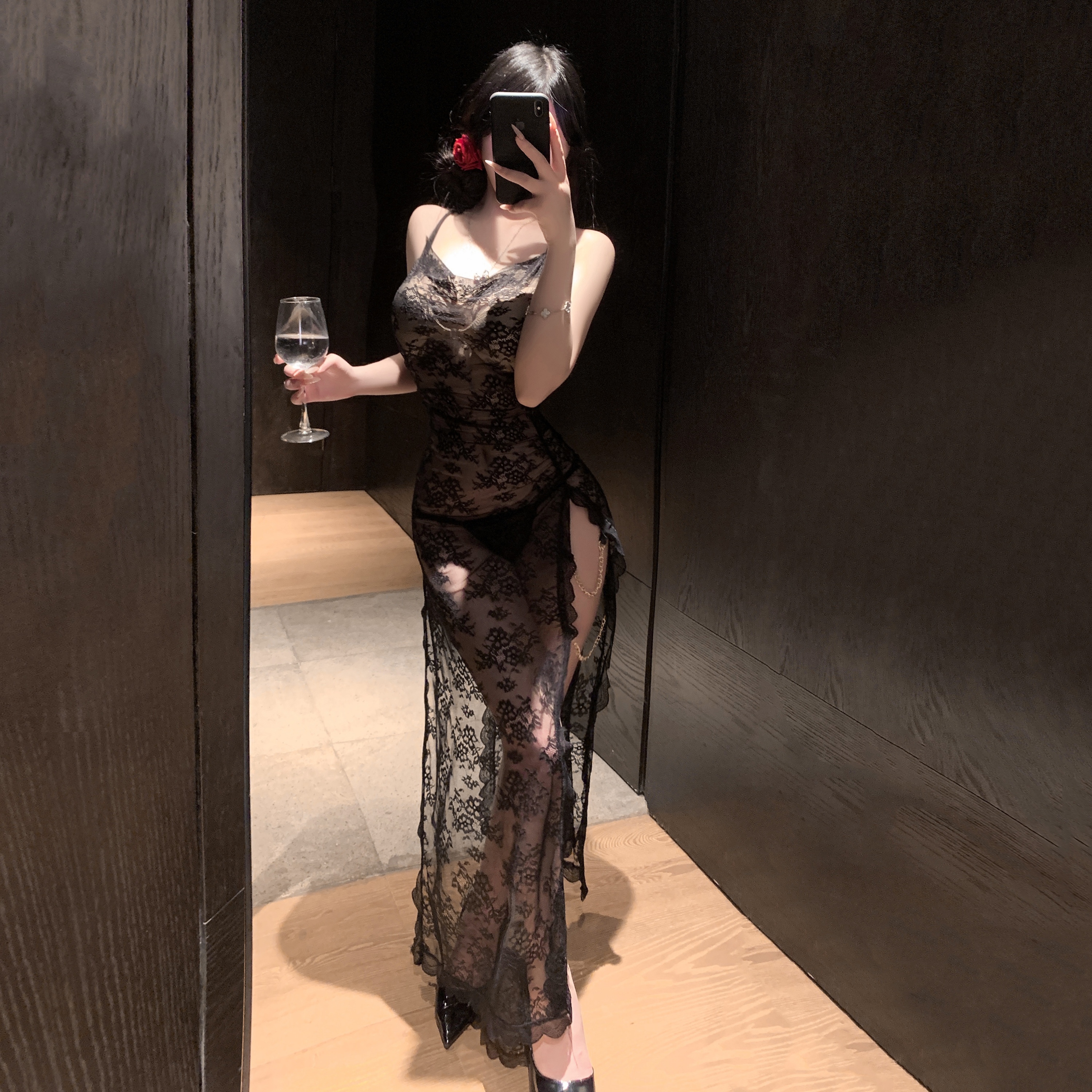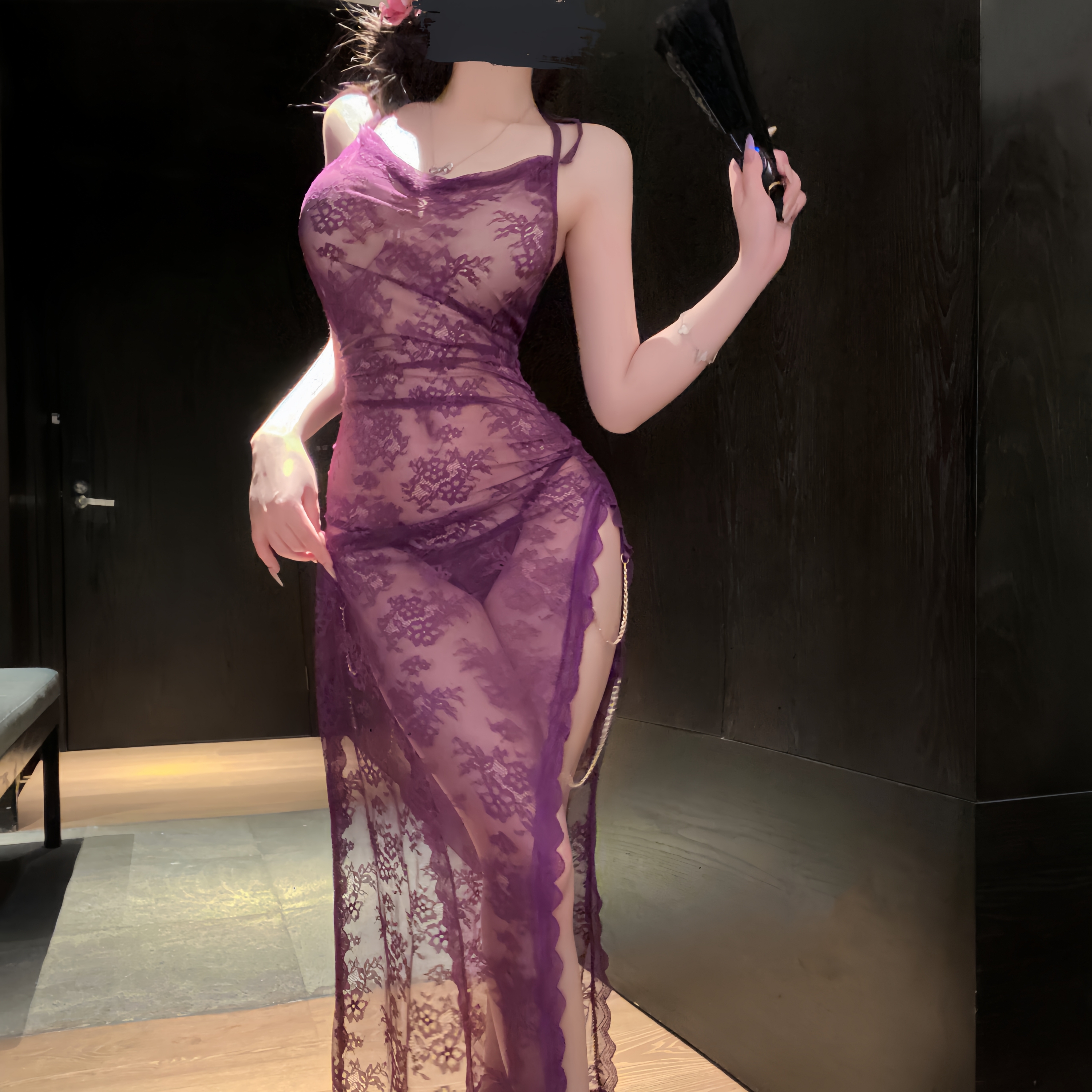 迷雾 链条裙若隐若现女睡衣制服 性感朦胧蕾丝旗袍情调开叉大码