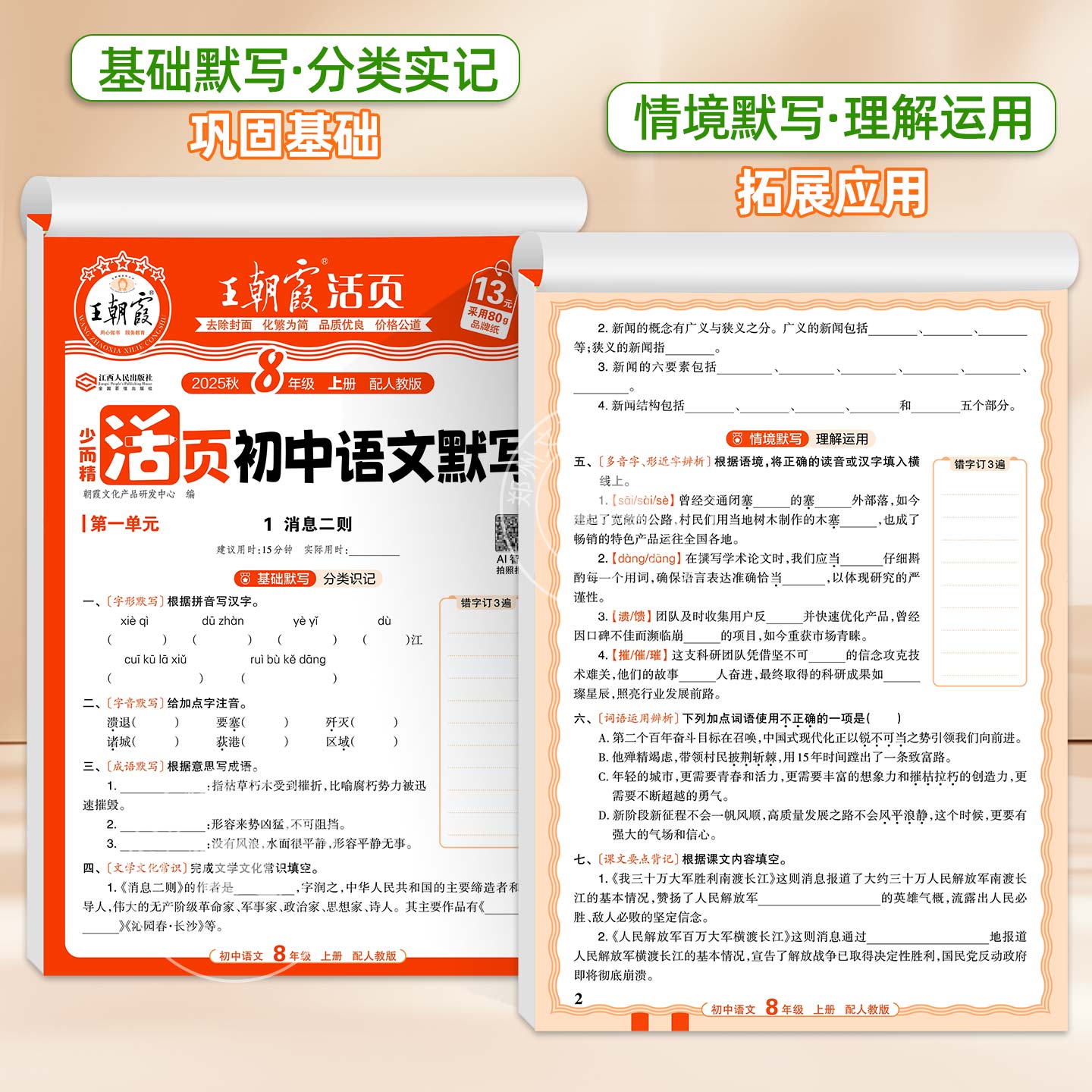 2025新王朝霞活页初中语文默写每日一练七年级八年级九年级上册下册同步练习册初一二三知识点记忆背诵默写同步课本专项训练天天练