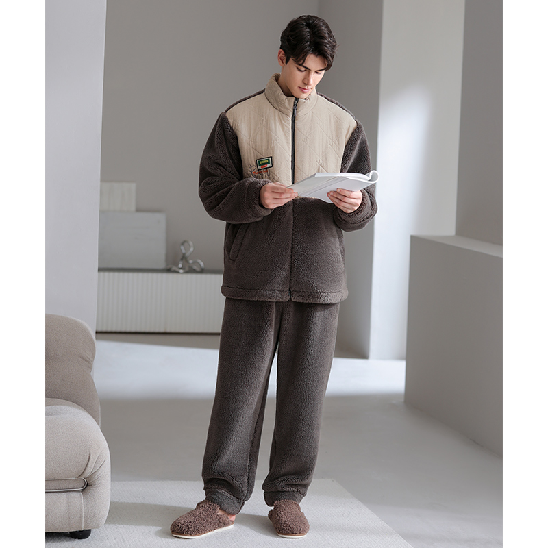 2025新款 嫚熙秋冬季 双面火山小磨毛女士睡衣情侣纯棉家居服套装