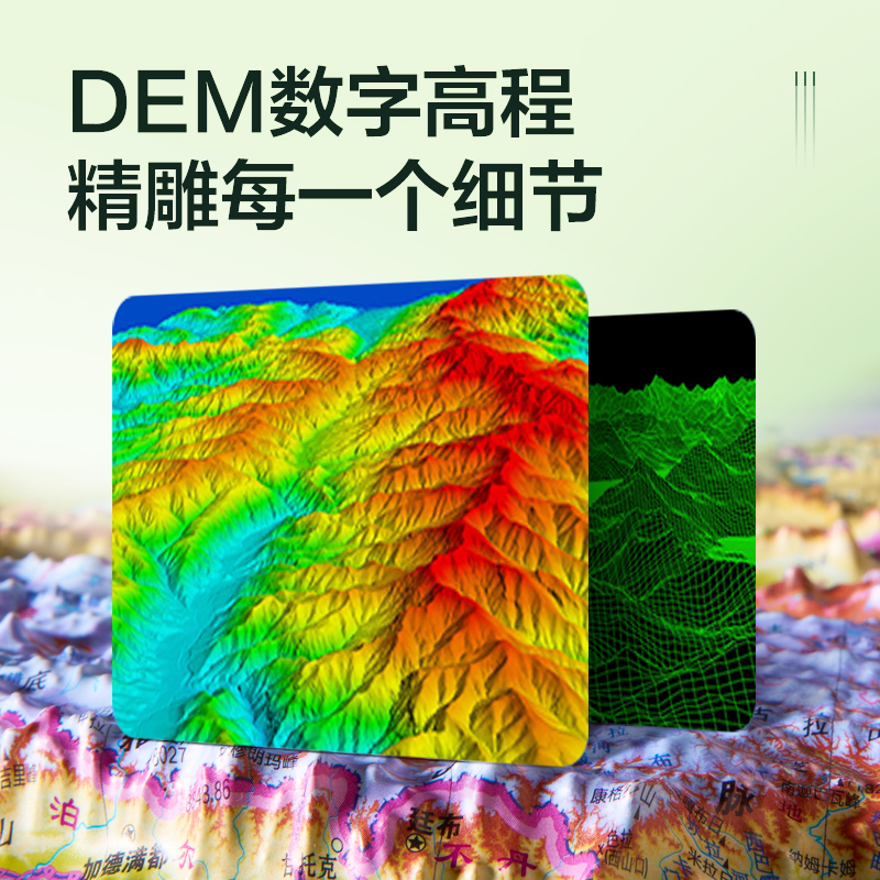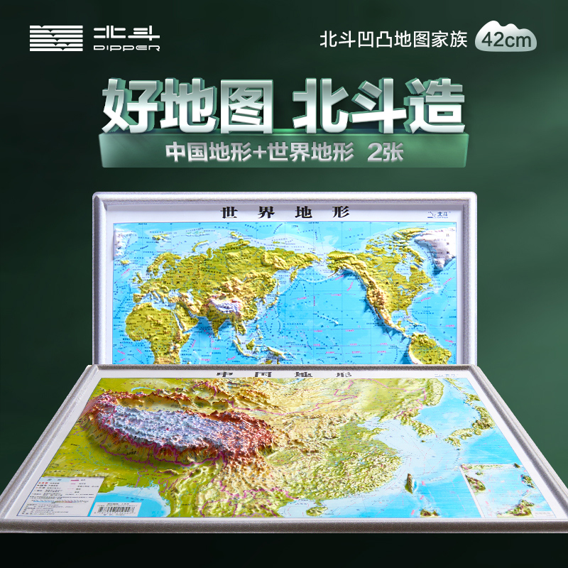 2张套装 世界地形 DEM数字高程制作地形凹凸地图 高清精雕版 PVC环保耐用 北斗42cm3D立体地图 面 中国地形