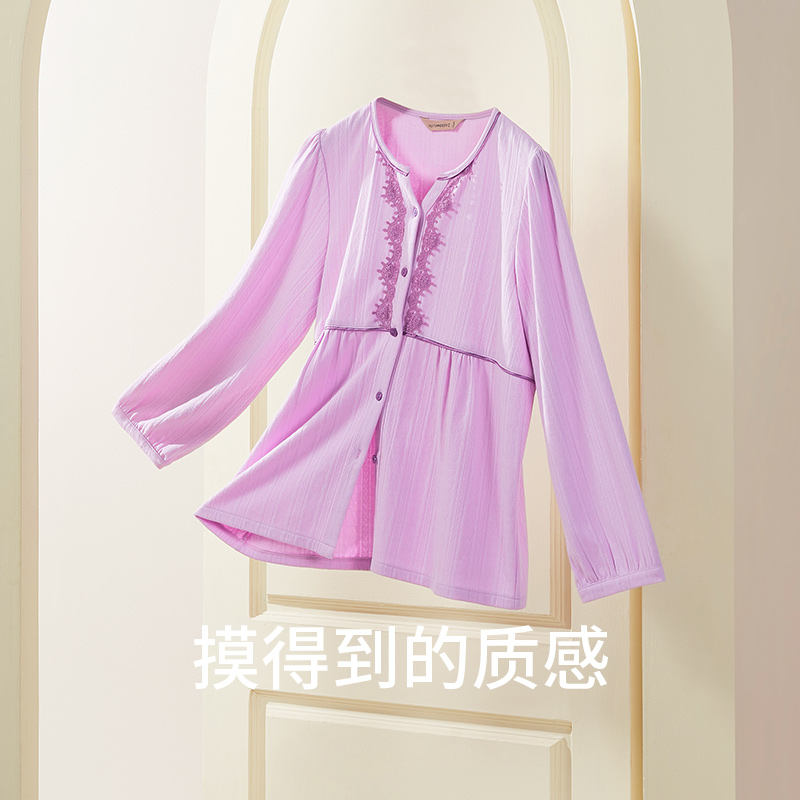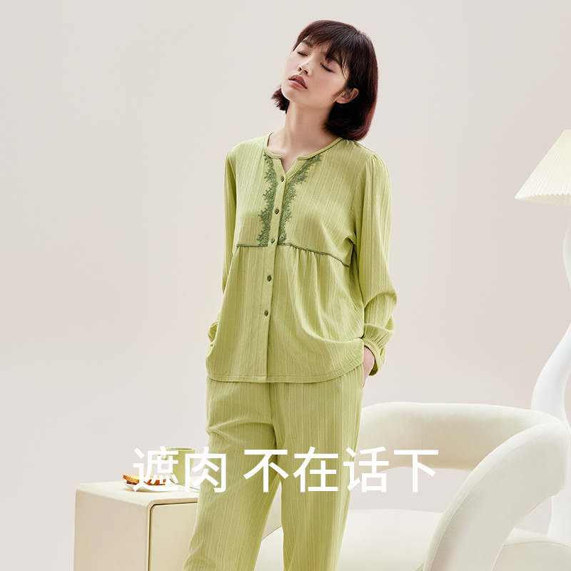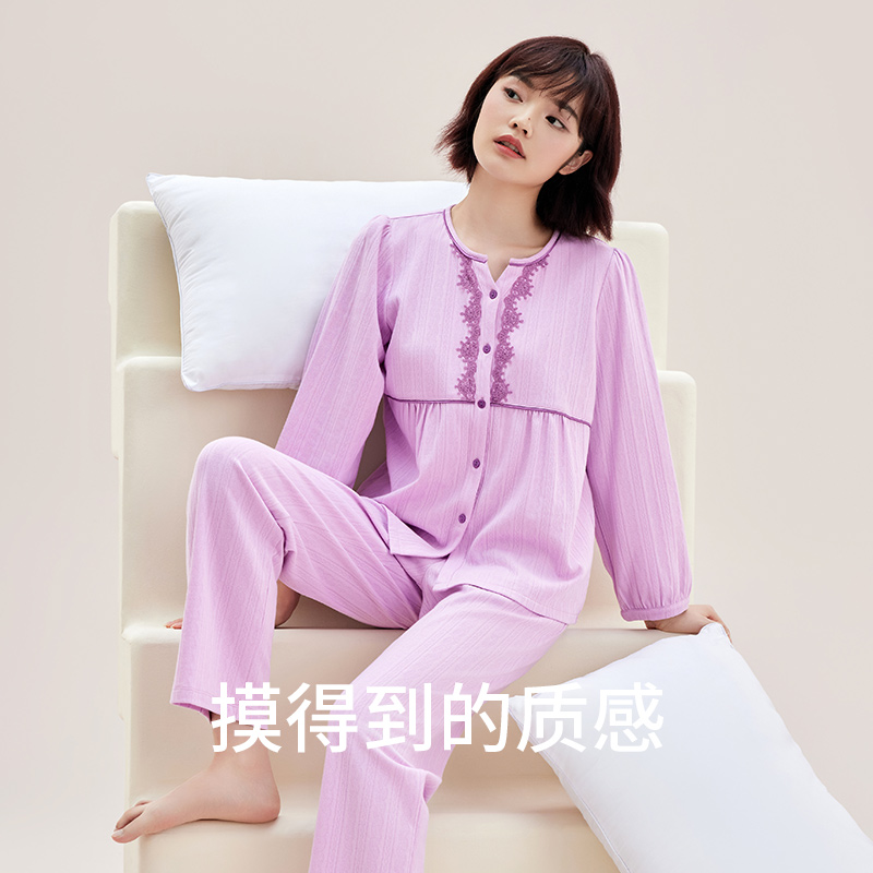 家居服套装 秋鹿纯棉提花超柔软蕾丝优雅圆领春秋季 睡衣女士长袖