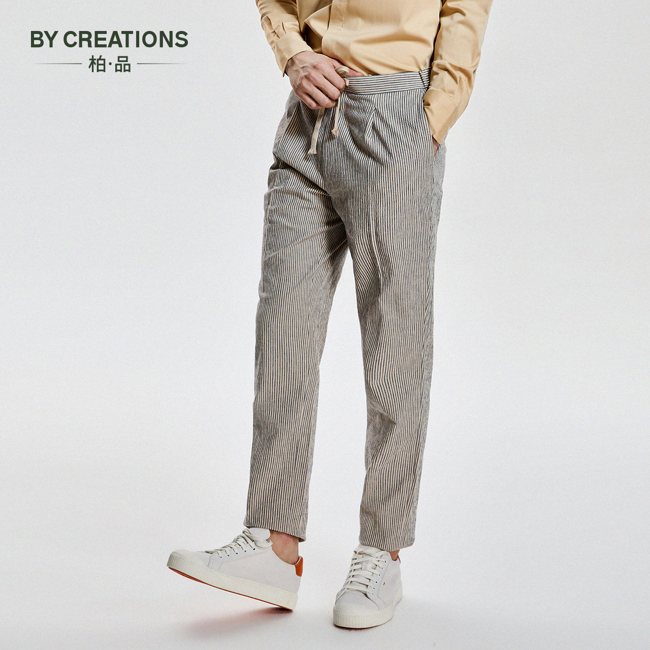 棉麻松紧腰单褶干爽透气长裤 柏品进口泡泡纱条纹商务休闲裤 男秋季