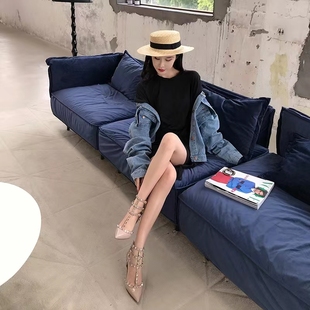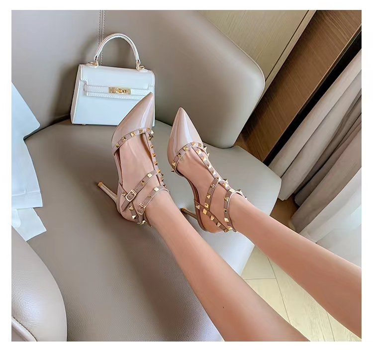 铆钉包头凉鞋 尖头后空网红单鞋 女细跟2025年夏新款 欧美裸色高跟鞋