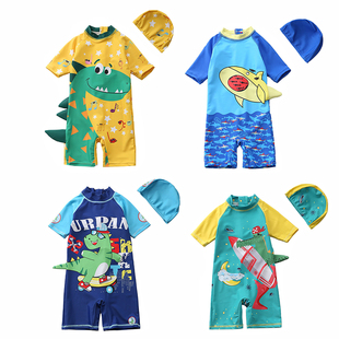 儿童泳衣男童连体卡通带帽泳装 沙滩防晒男宝宝游泳衣 中小童短袖