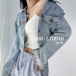 欧美复古浅色牛仔外套女早秋港味短款 夹克上衣 小外套宽松炸街工装