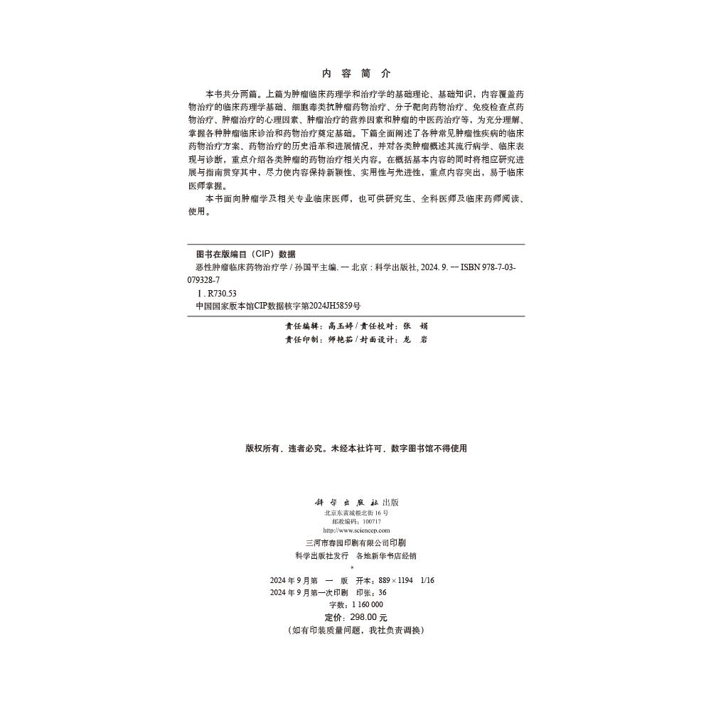 供研究生 主编 全科医师及临床药师阅读使用 科学出版 9787030793287 恶性肿瘤临床药物治疗学 社 孙国平