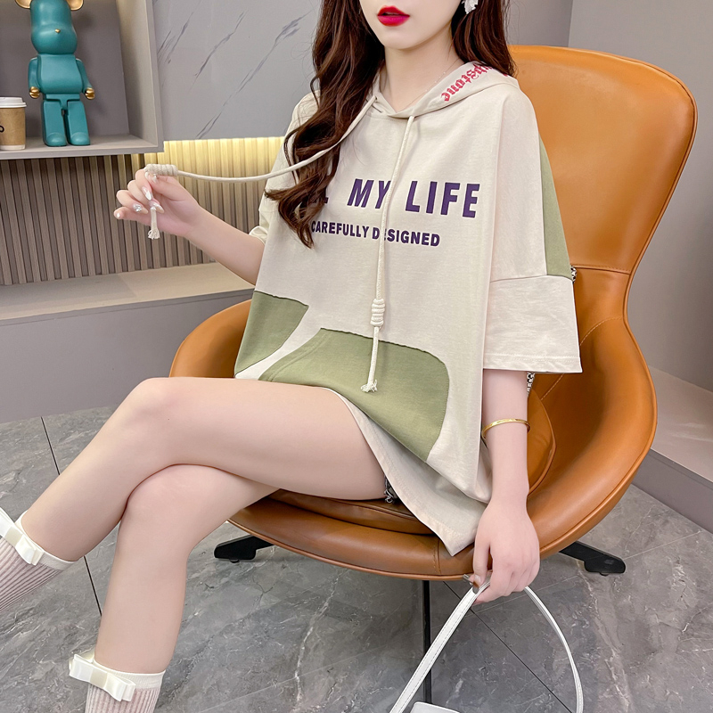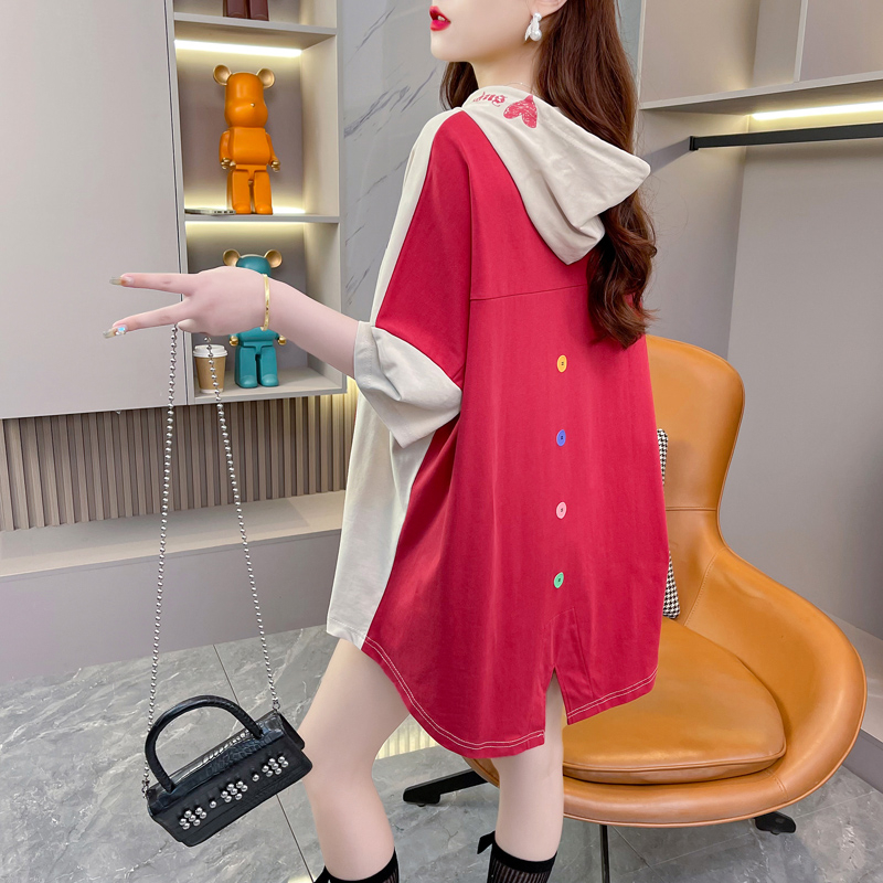 胖mm遮肚显瘦200斤撞色上衣 大码 高级感独特别致连帽短袖 t恤女夏季