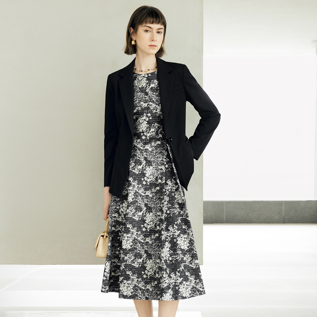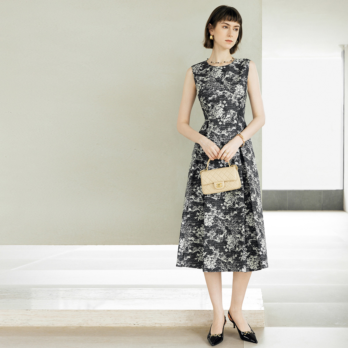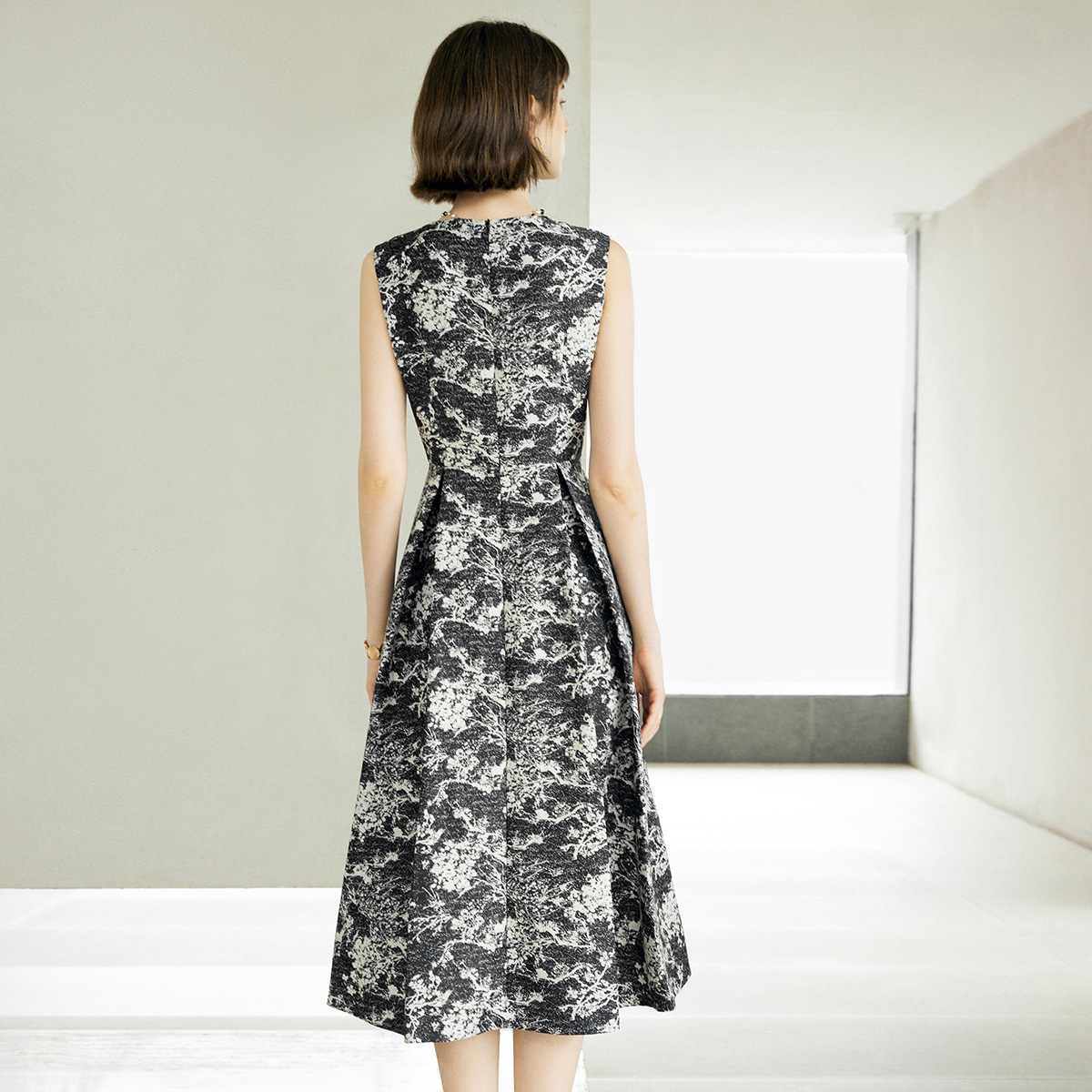 裙子 无袖 颜域提花收腰圆领连衣裙女秋2025新款 复古优雅气质中长款