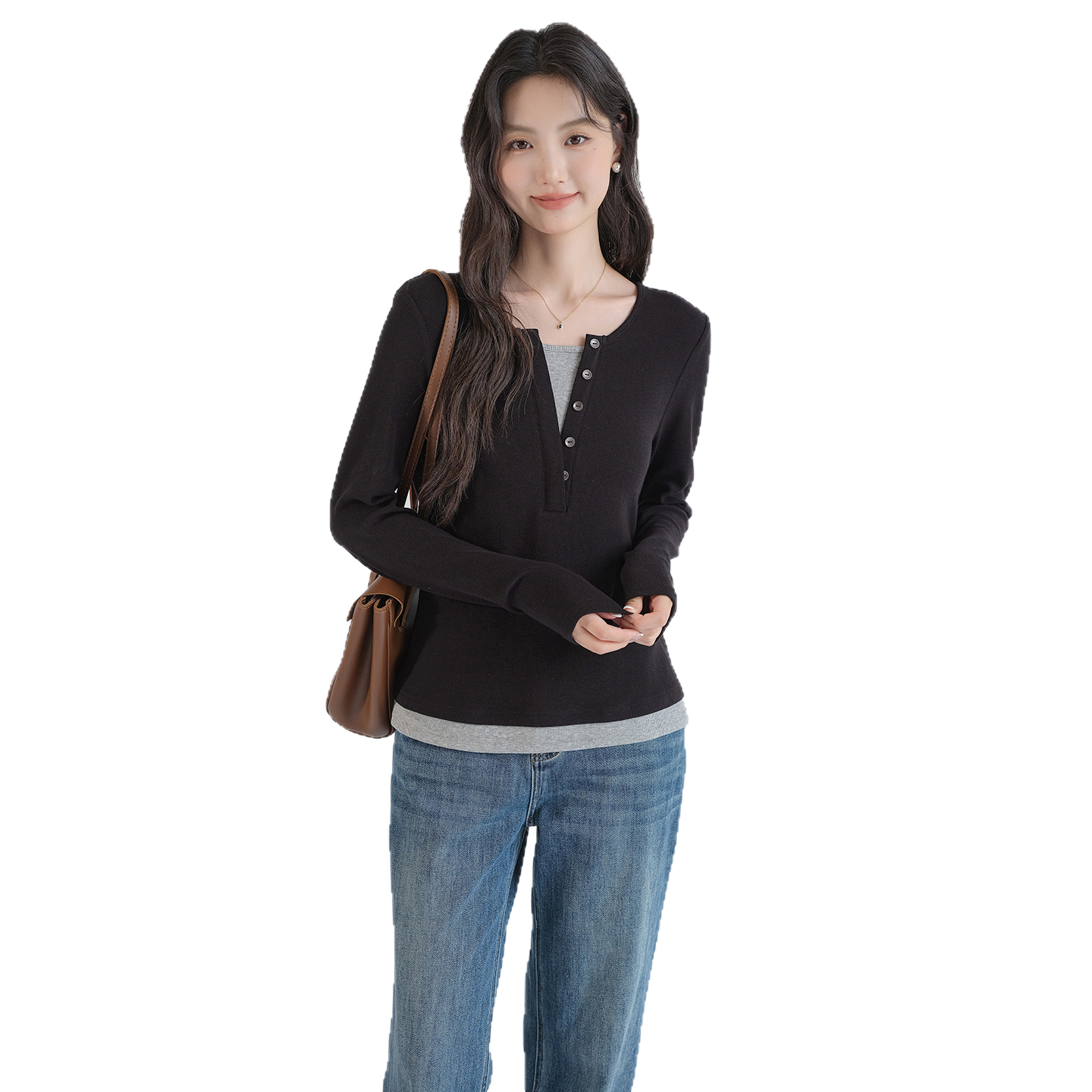 2025秋新款 蓝若水大码 别致V领针织上衣 糯感慕斯假两件打底衫