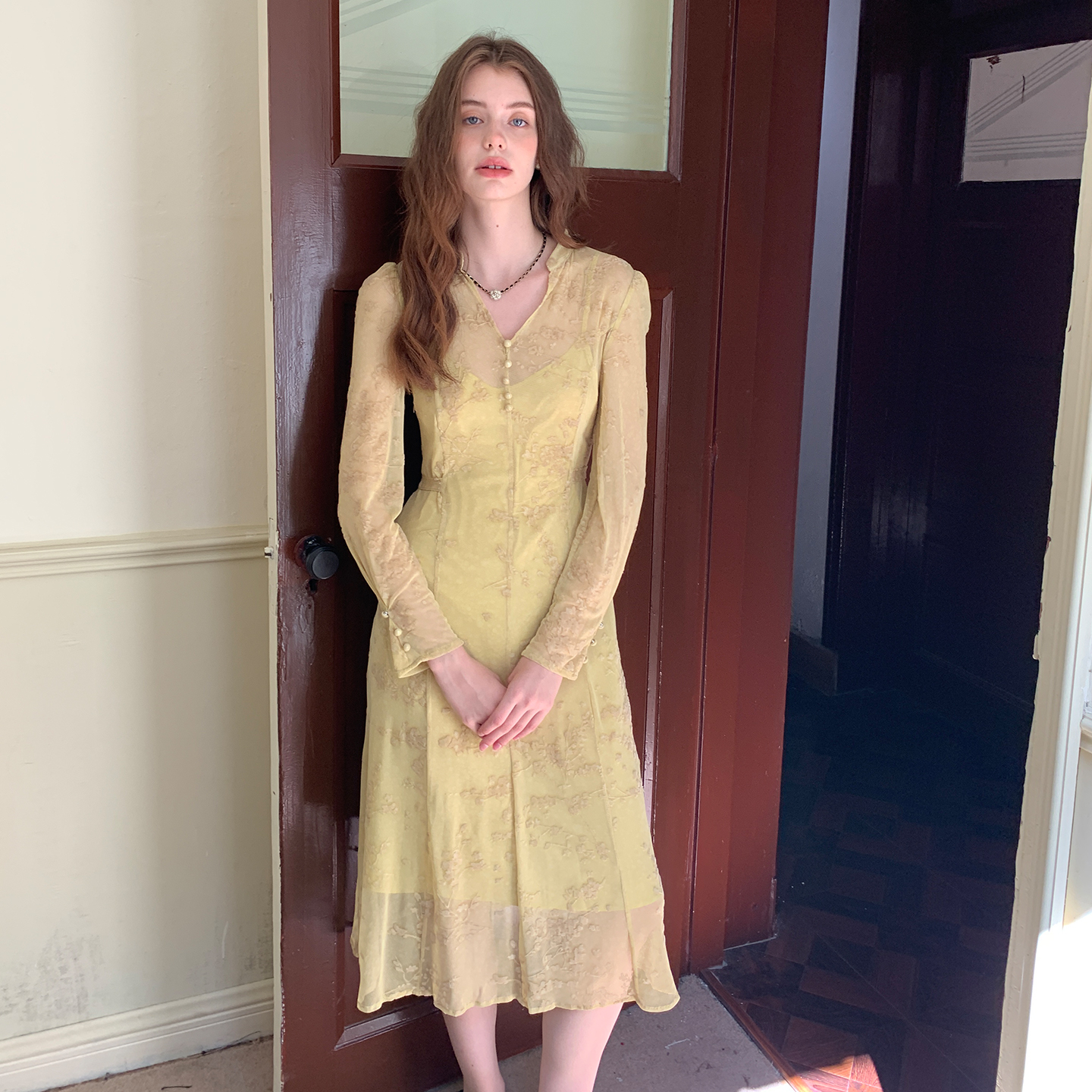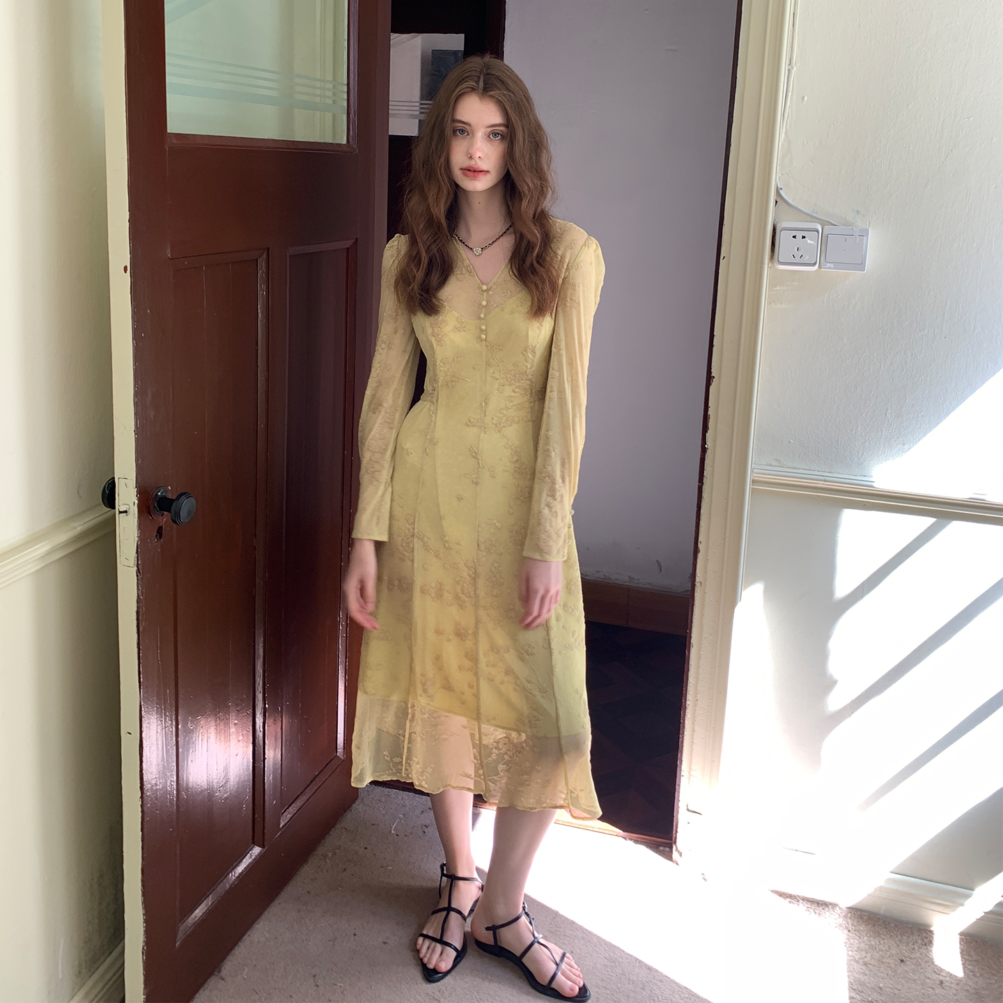 竹依依 复古黄色海边度假薄纱连衣裙女秋浪漫气质感长裙 原创法式