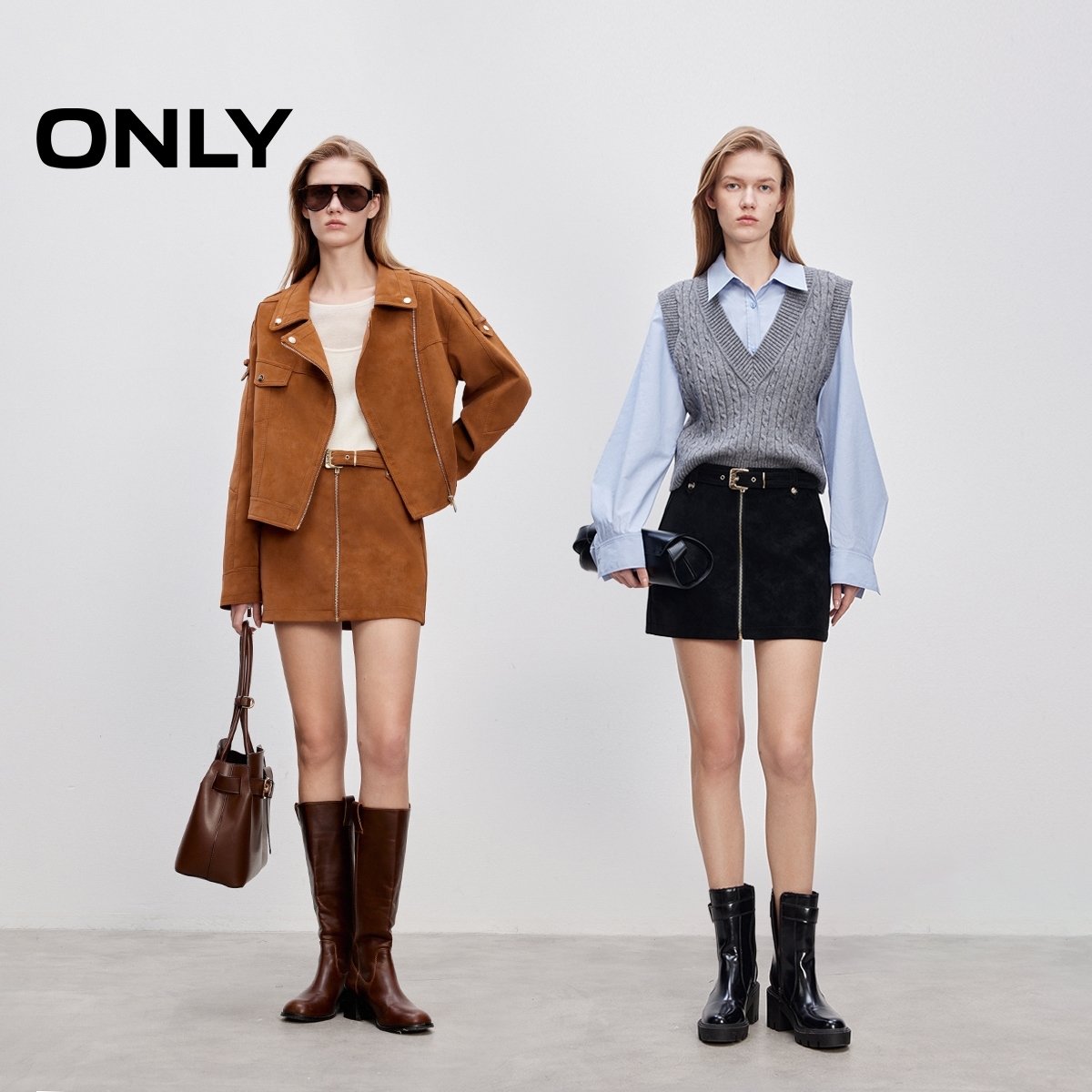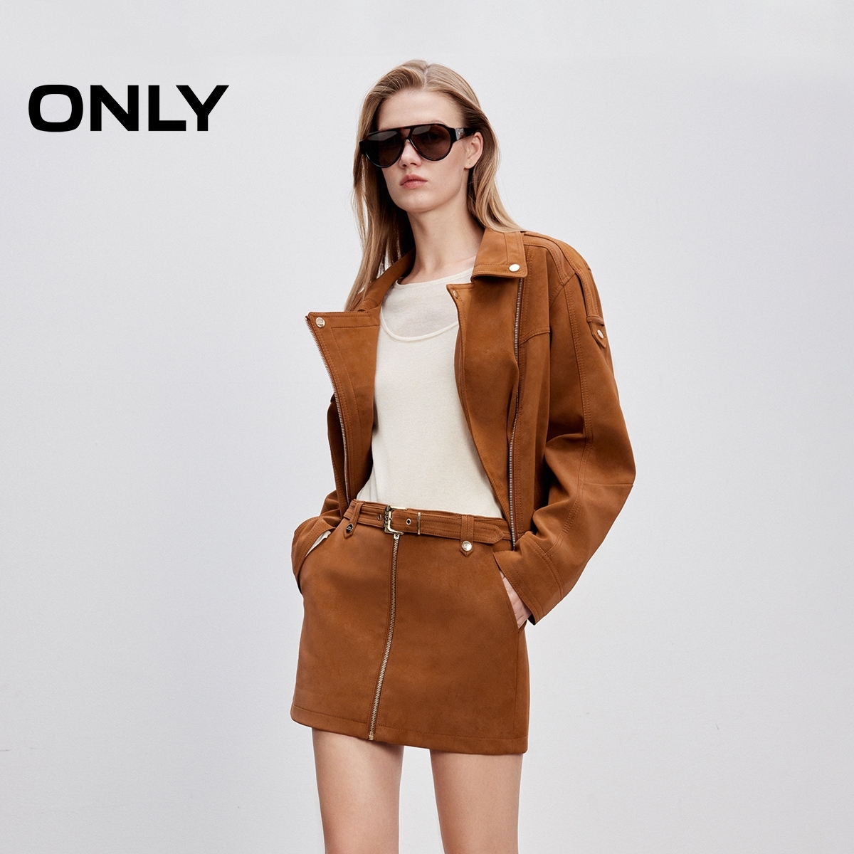 经典 时尚 挺括绒面面料设计A字PU短裙半身裙女 新款 ONLY2025秋季