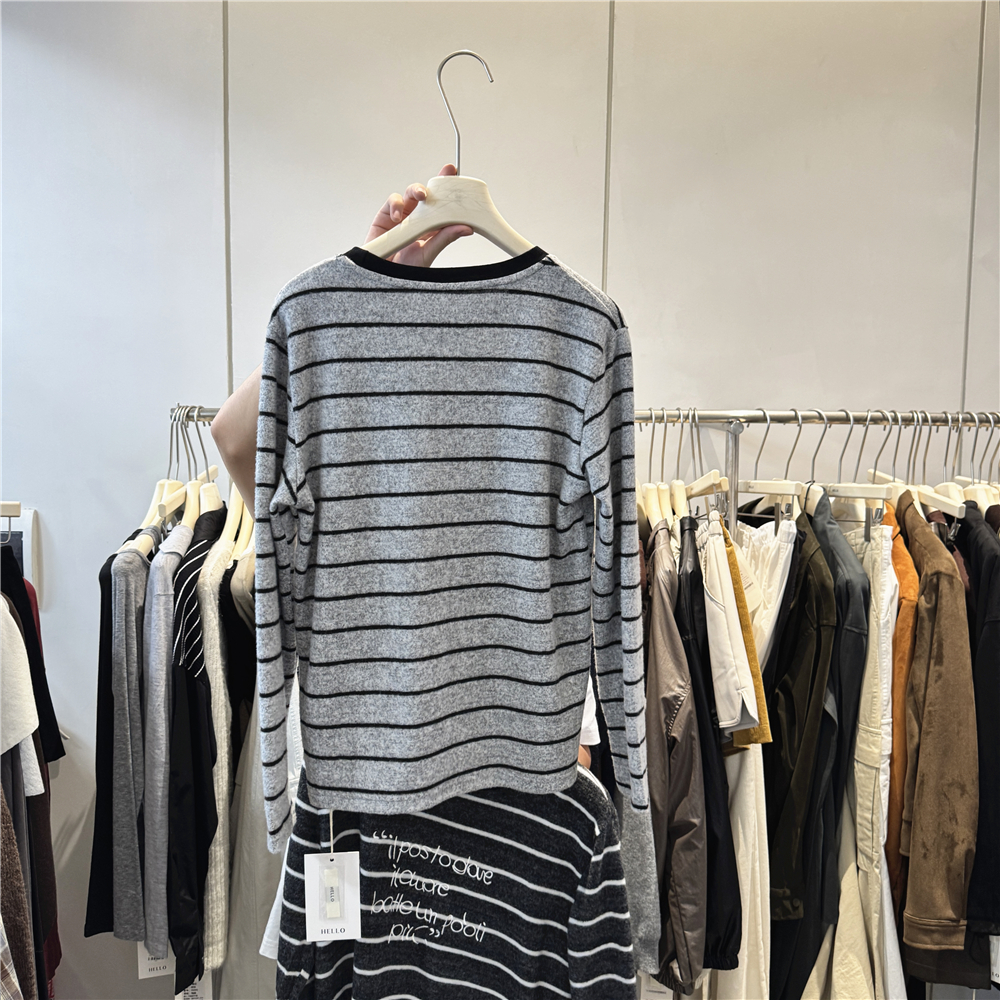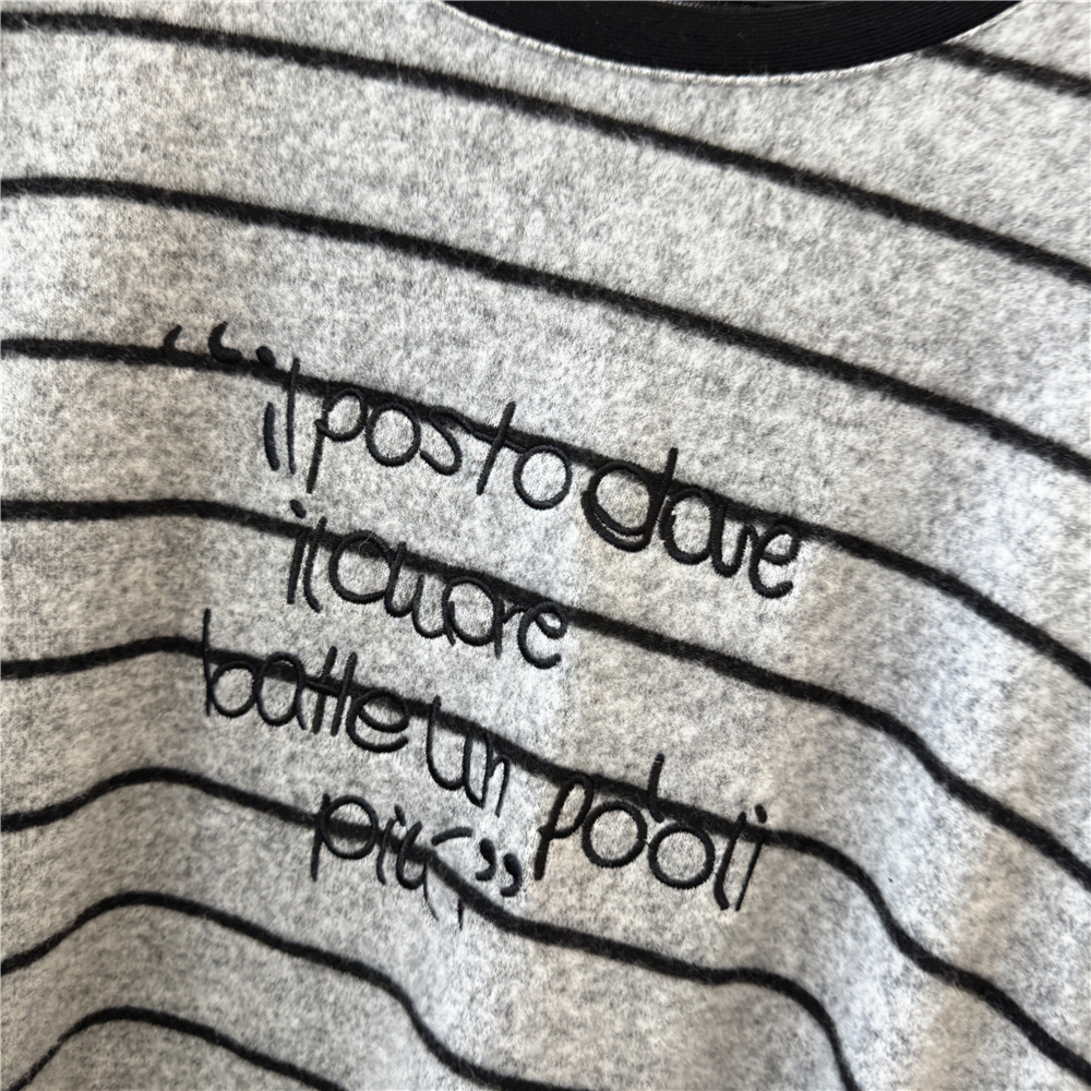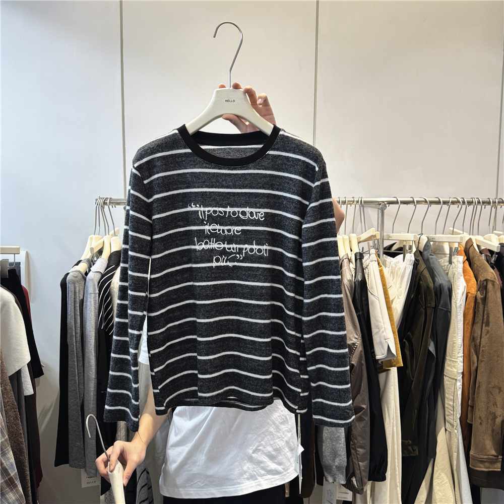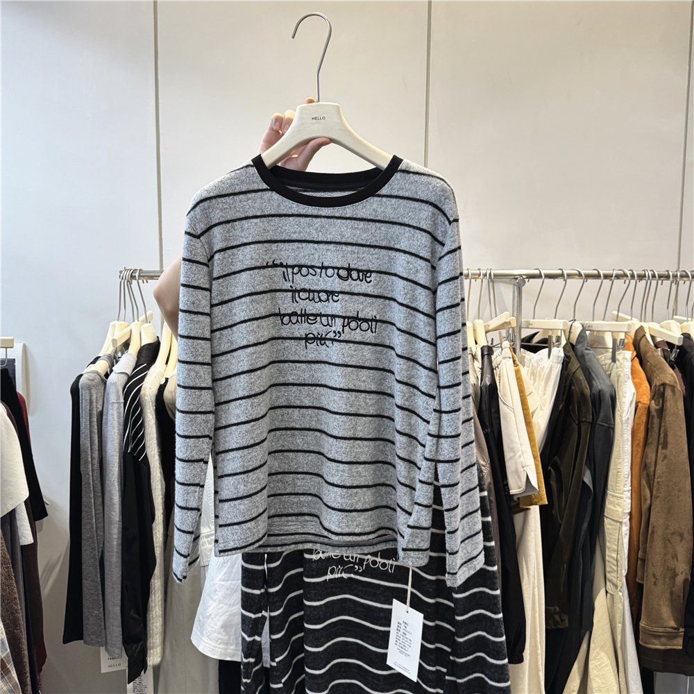 胖妹妹大码 T恤女秋冬宽松上衣 200斤拼色圆领条纹刺绣字母磨毛长袖