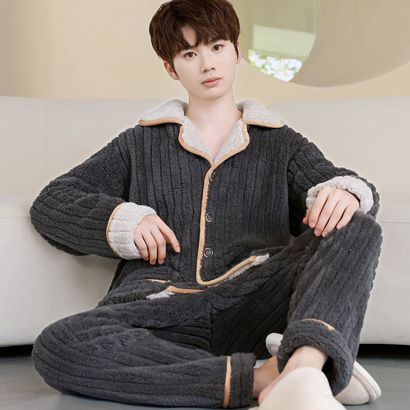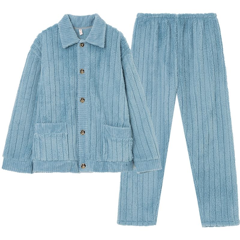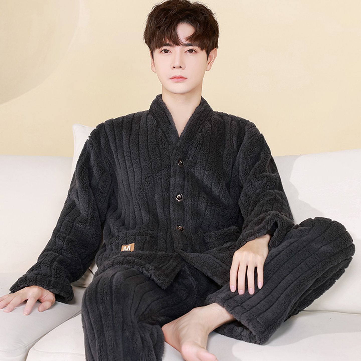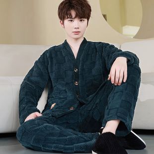 加厚长毛绒开衫 保暖大码 睡衣男法兰绒秋冬珊瑚绒家居服可外穿套装