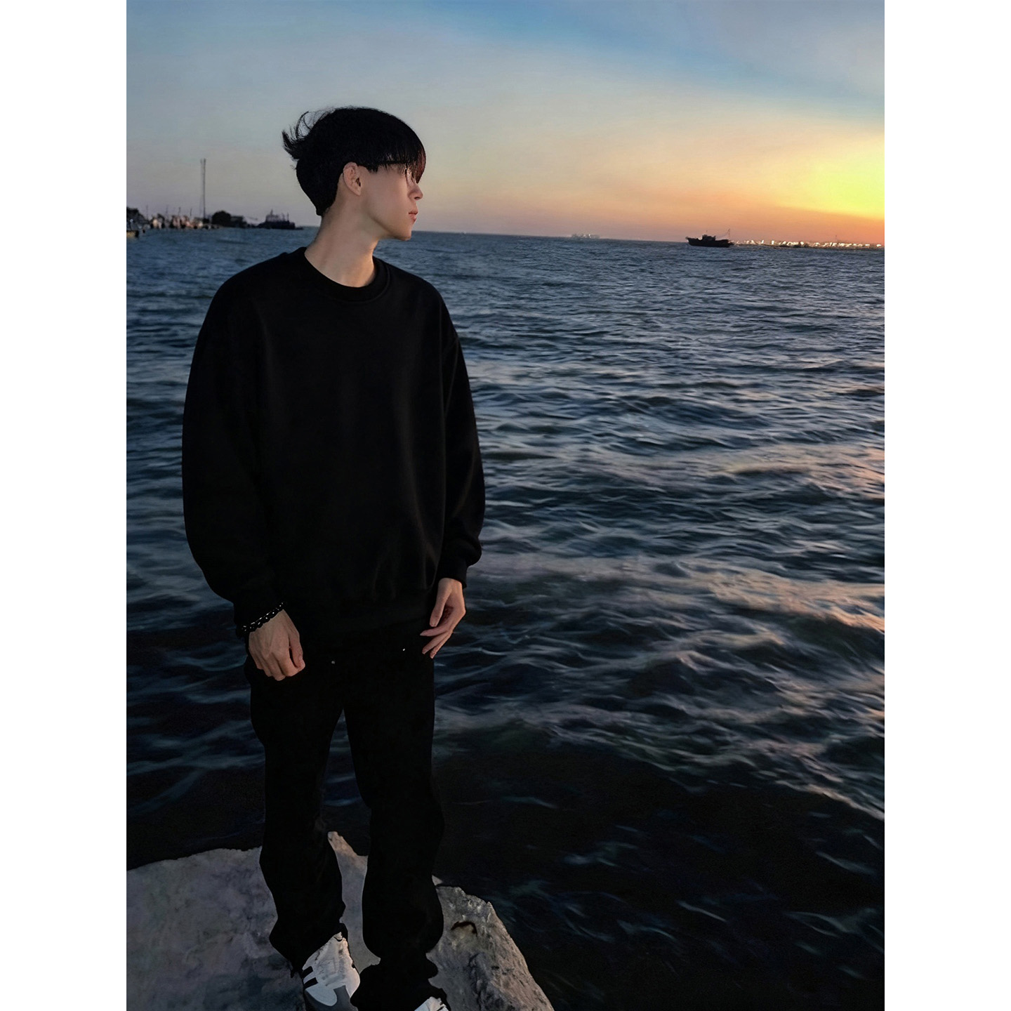 内搭打底衫 t恤基础款 重磅圆领卫衣男秋冬加绒保暖长袖 白花灰美式
