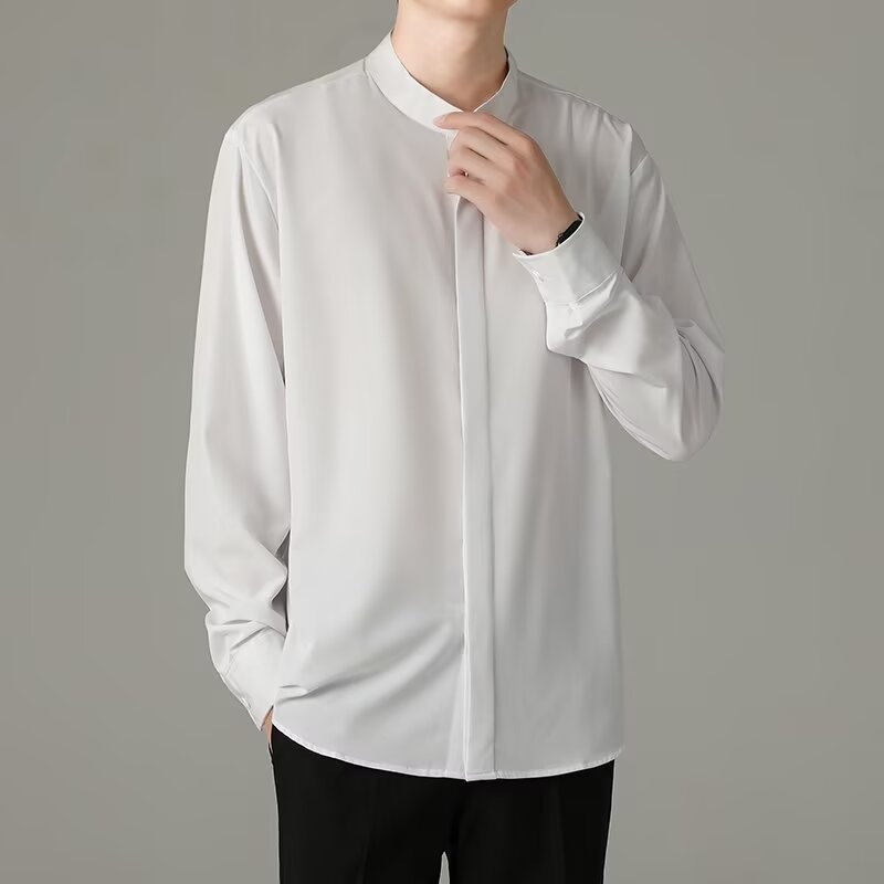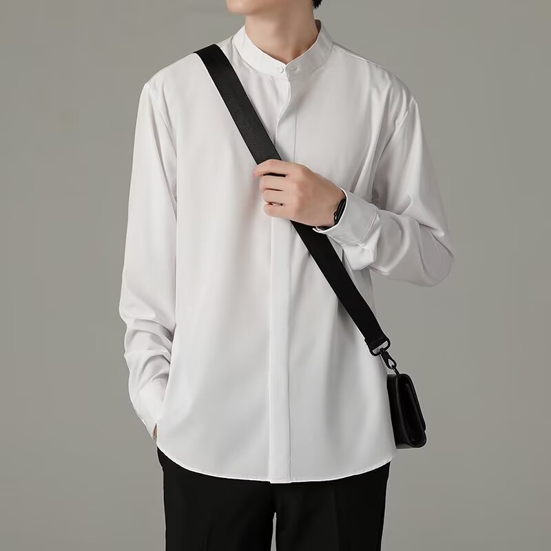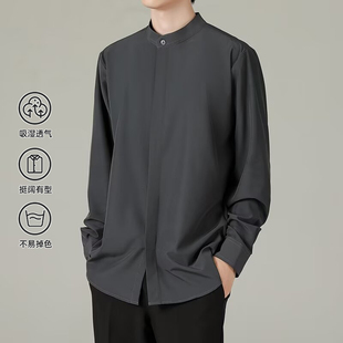 轻熟风修身 亨利领衬衫 新中式 秋季 黑色衬衣高级感休闲上衣潮 男士