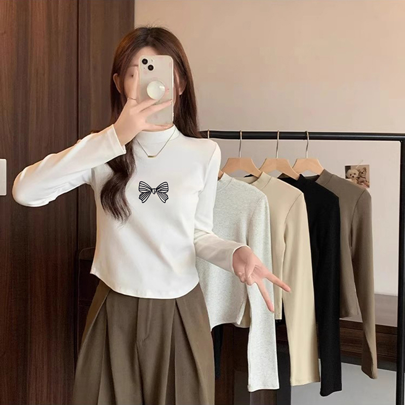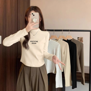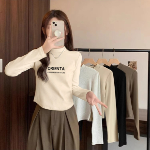 t恤磨毛加厚短款 半高领打底衫 白色长袖 新款 内搭上衣 女2025秋冬季