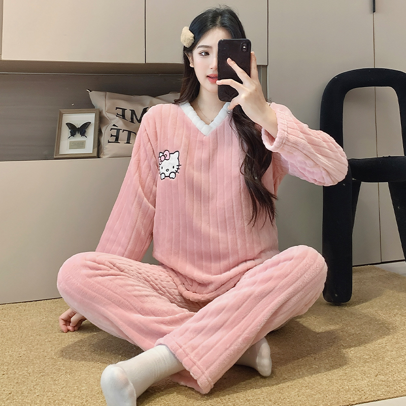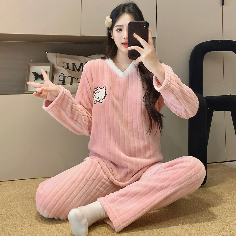 大码 春秋开衫 女士家居服 加厚珊瑚绒睡衣女冬法兰绒加绒套装 秋冬季