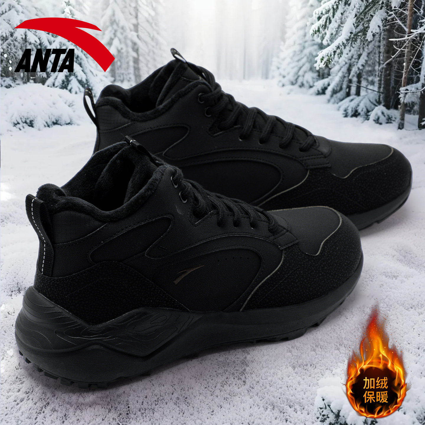 皮面防泼水高帮黑色运动鞋 安踏男鞋 子秋冬2025新款 加绒鞋 男 二棉鞋
