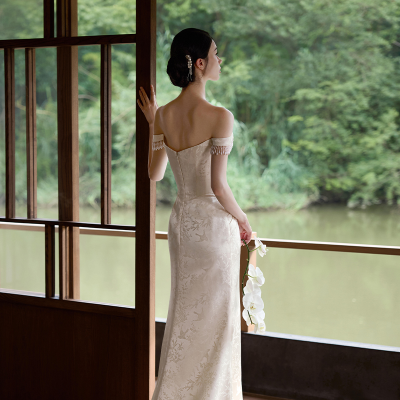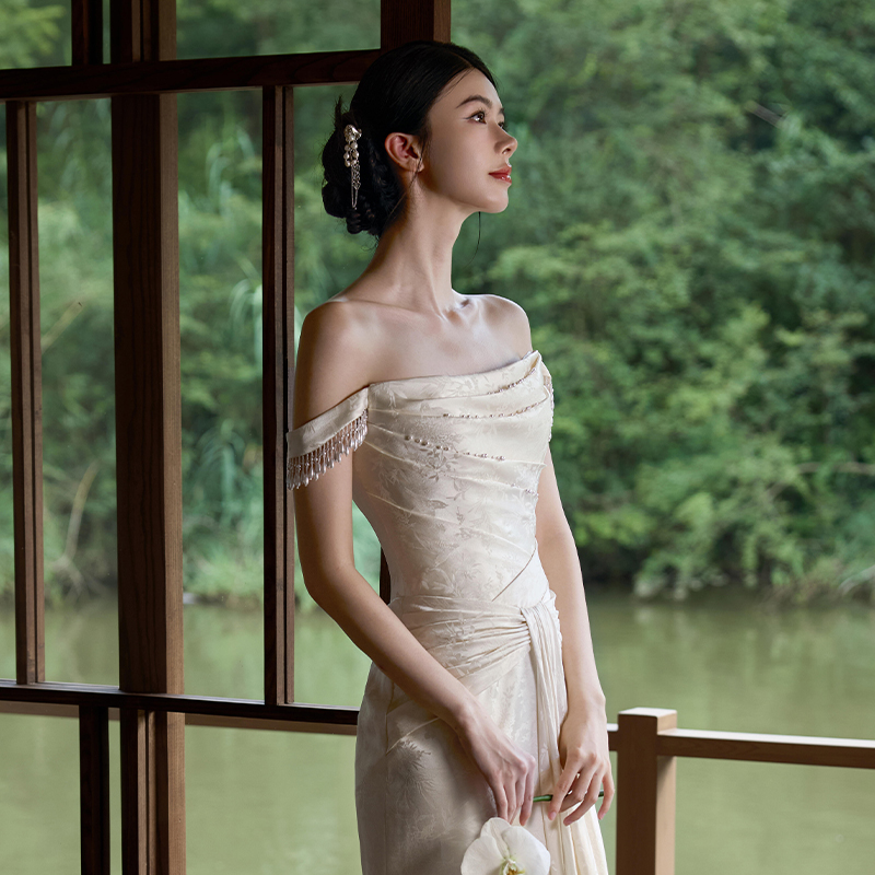 一字肩抹胸晚礼服浪漫婚礼主持人年会宴会成人礼生日战袍晚装 白色