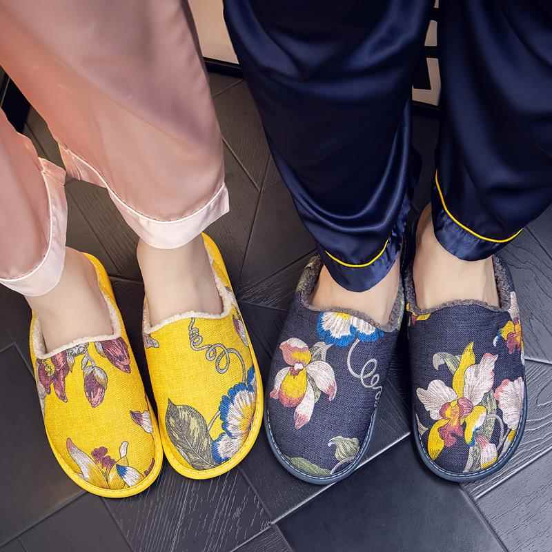 秋冬民族风布拖鞋 防滑1008e 居家女情侣家用保暖室内带绒拖鞋