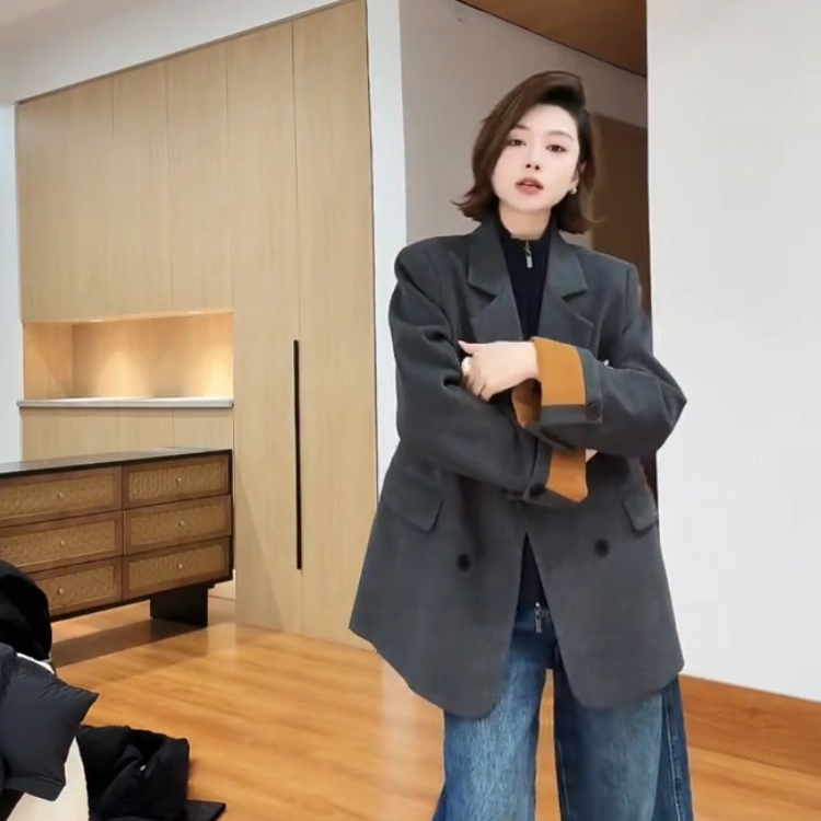 宽松显瘦百搭翻领上衣 外套女2025秋冬新款 韩版 极简风撞色披肩西装