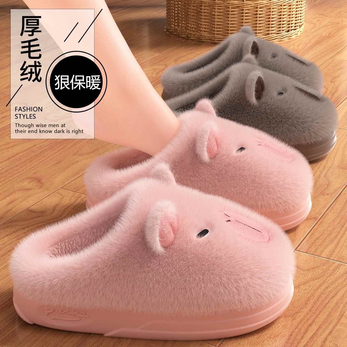 室内家居可爱防滑厚底保暖毛绒棉鞋 红豆棉拖鞋 2025新款 秋冬季 女款