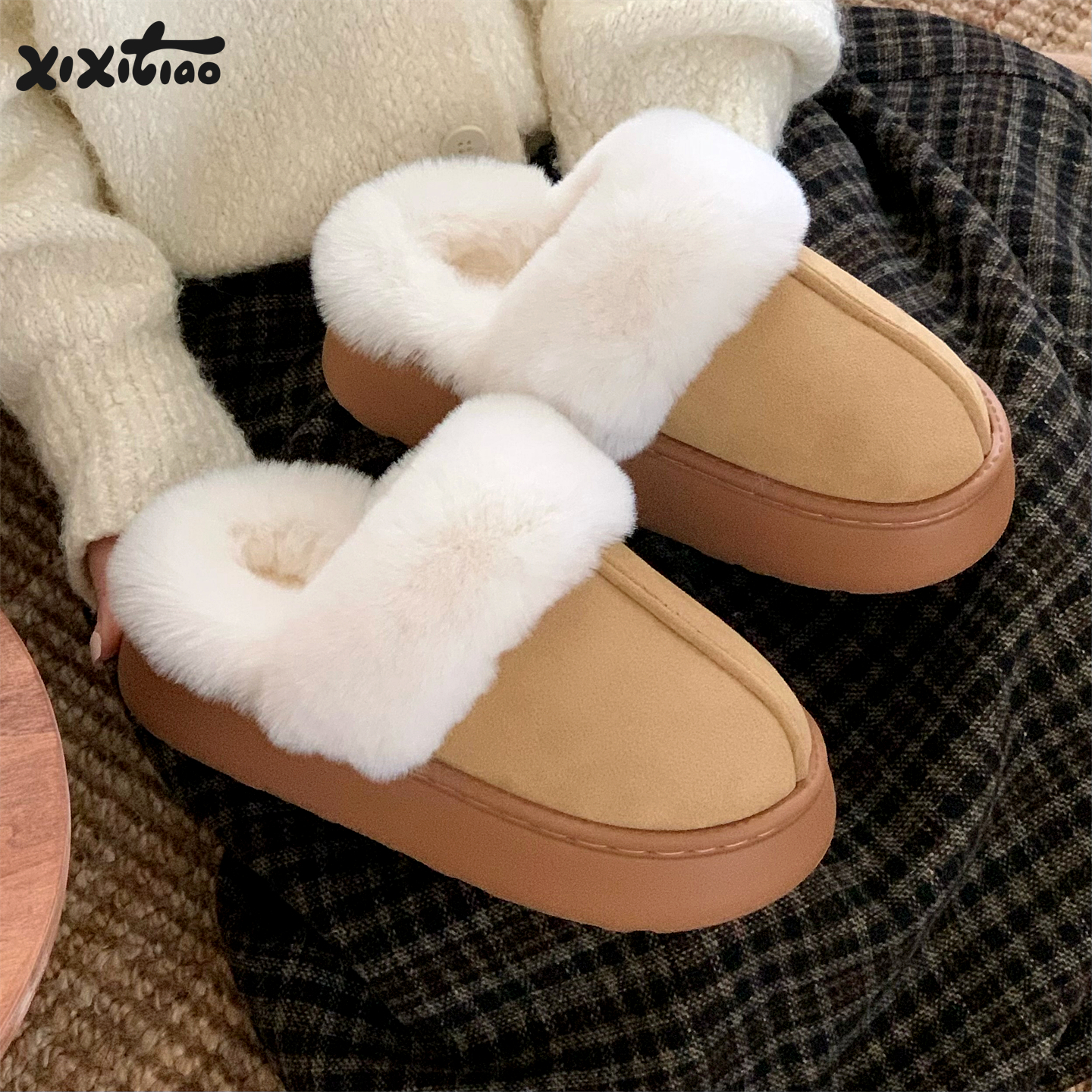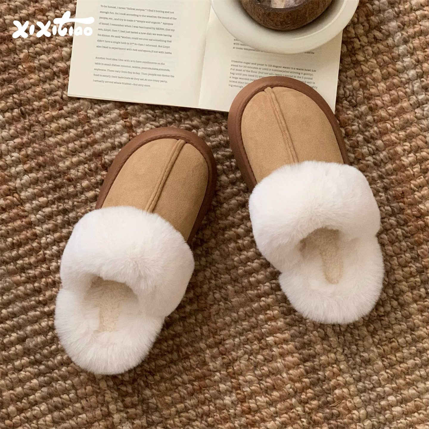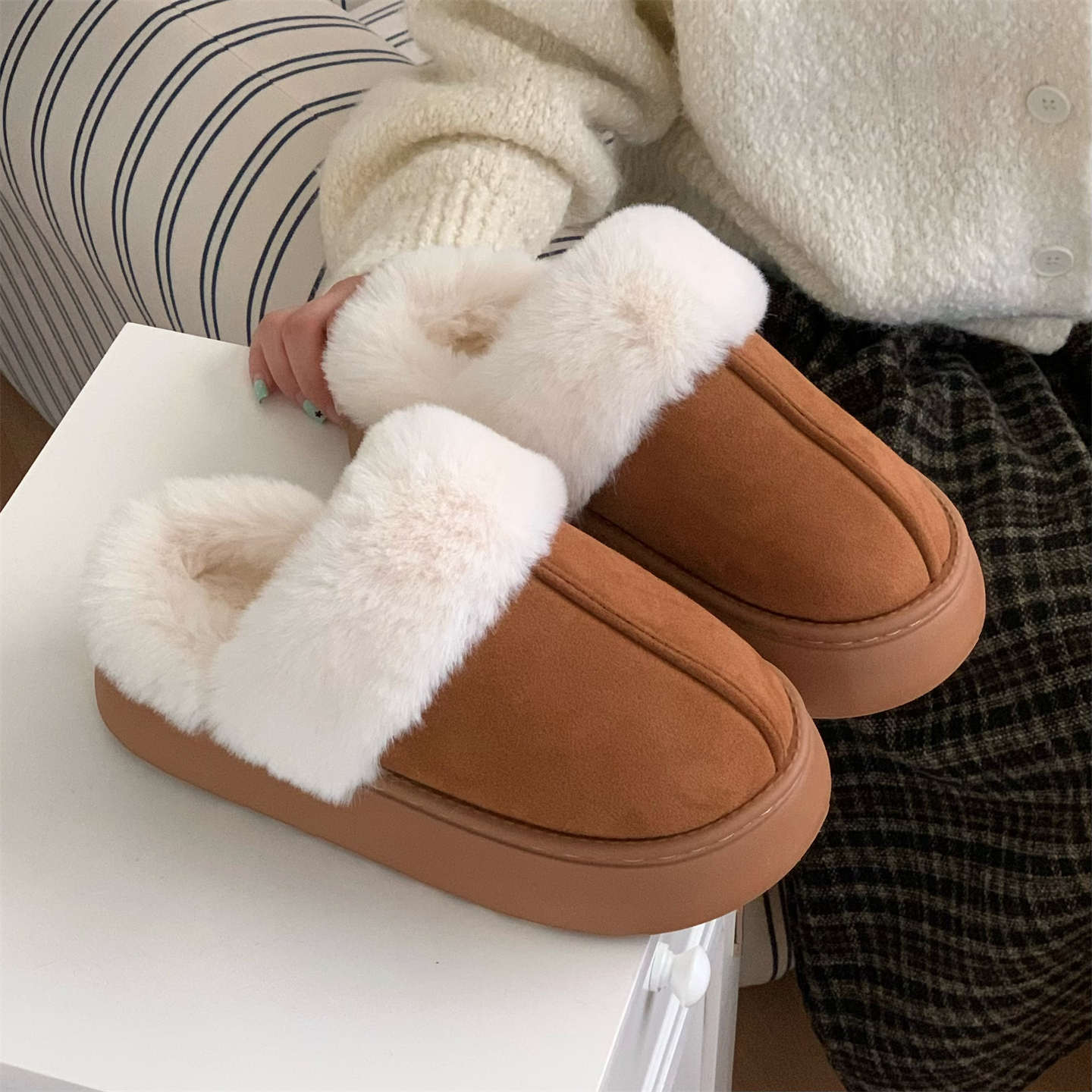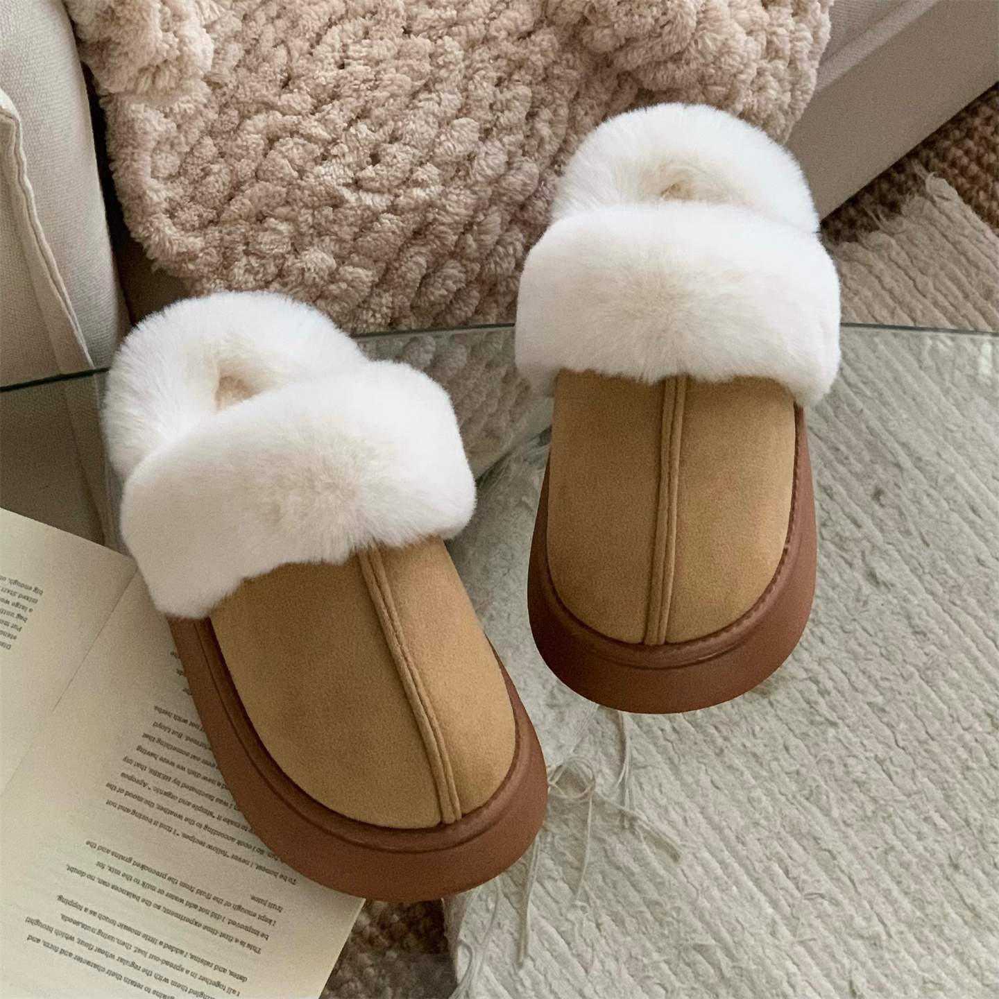 保暖舒适居家棉拖鞋 厚底ins女士防滑毛绒雪地靴拖鞋 冬 新款 细细条