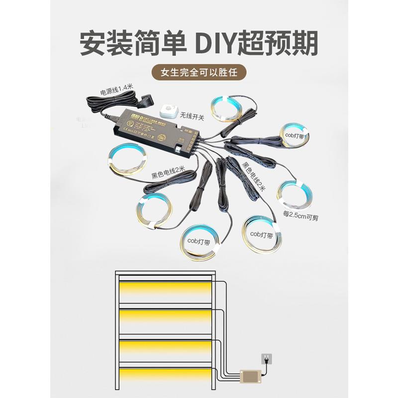 智能橱柜手办展示柜子酒柜衣柜书柜感应cob免开槽led灯条黑色电线