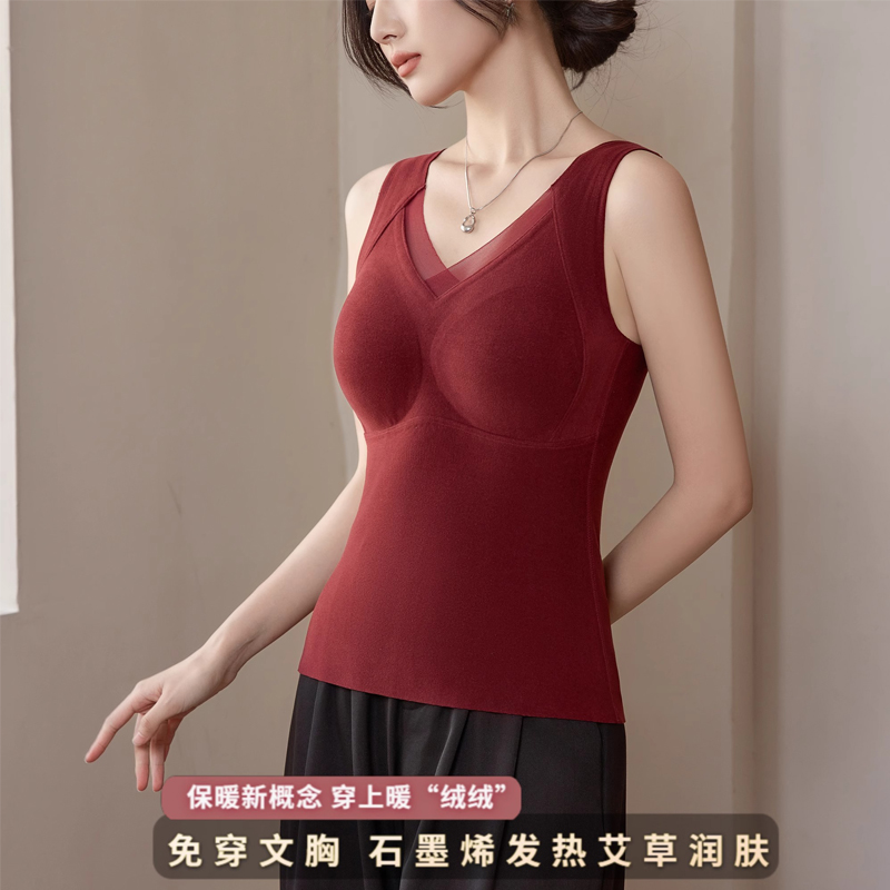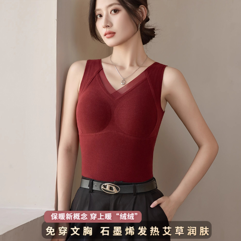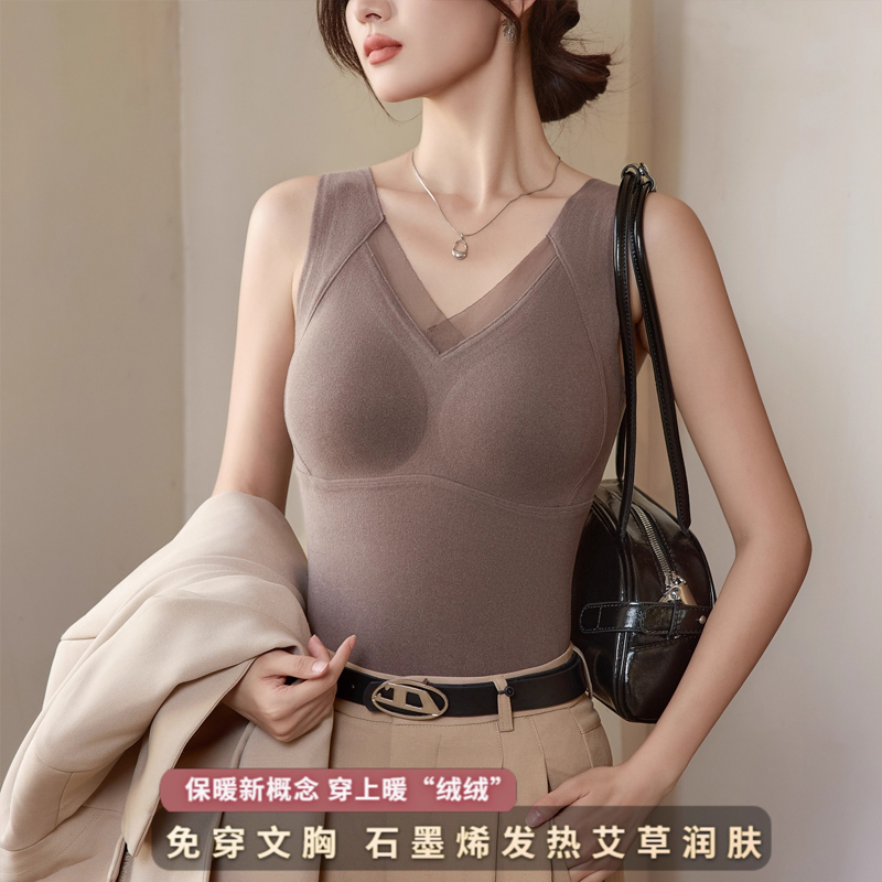 石墨烯磨毛自发热保暖背心蕾丝固定一体杯德绒修身 显瘦内搭女文胸