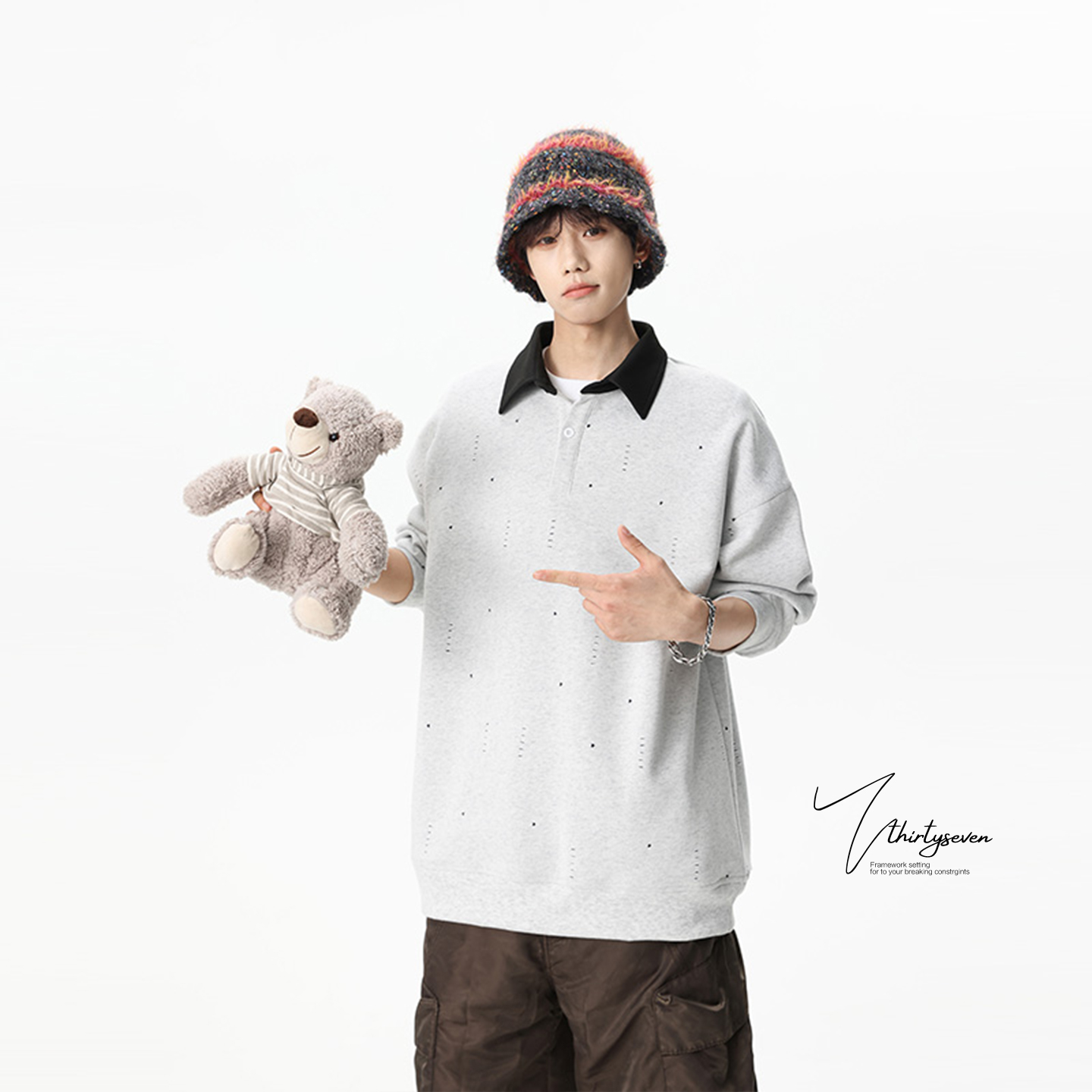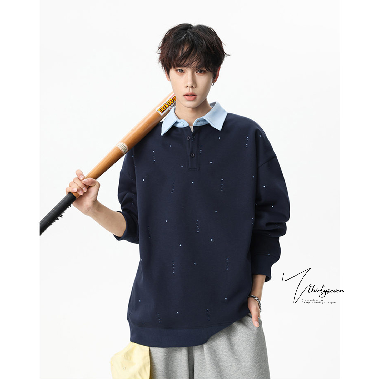 POLO衫 潮牌设计感长袖 潮牌满天星撞色翻领套头卫衣男秋季 V37美式