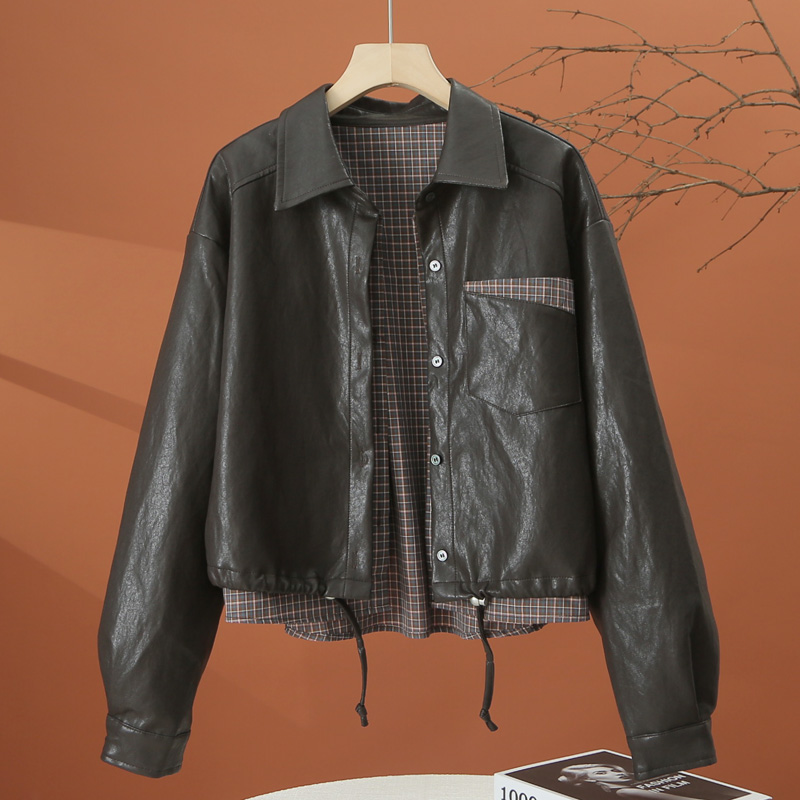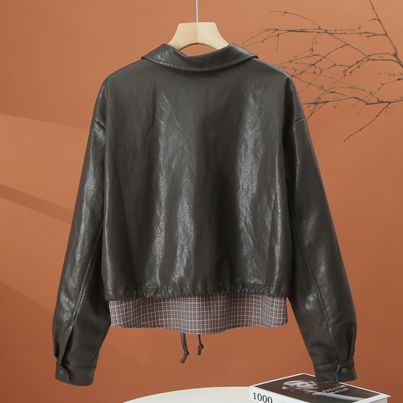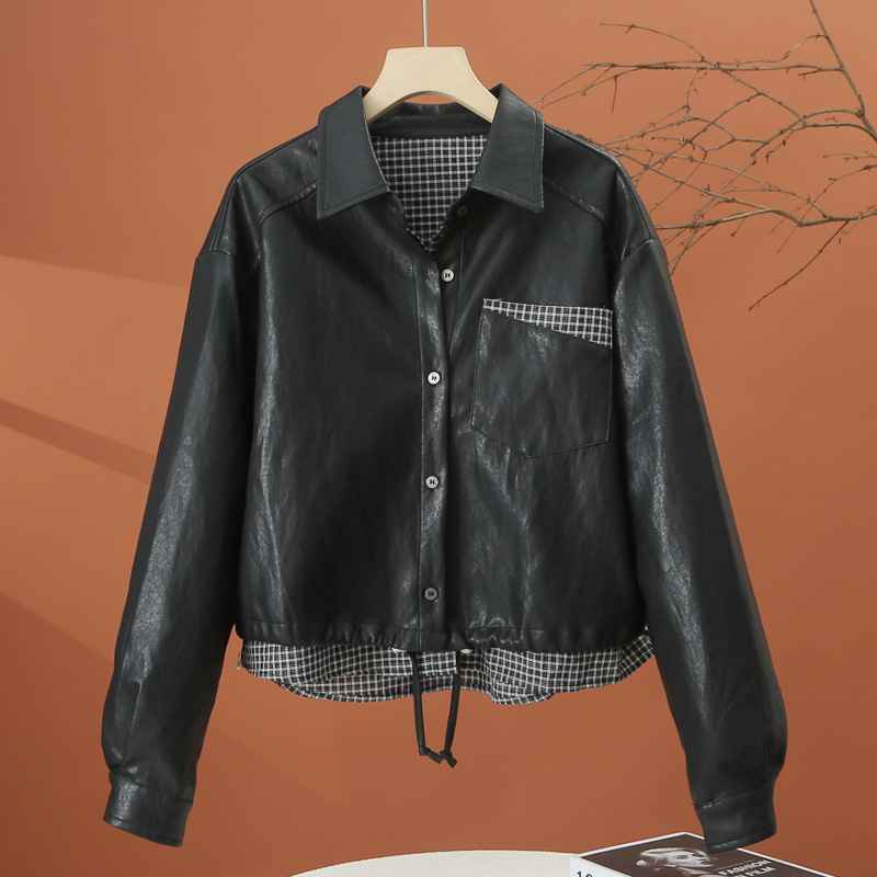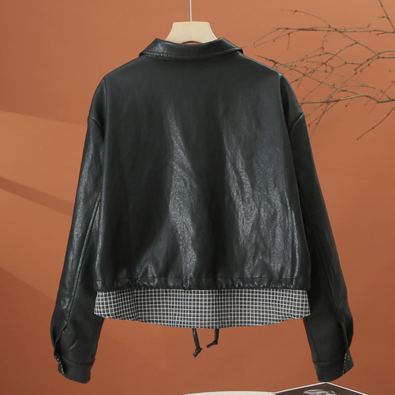 洋气韩版 时尚 宽松休闲上衣 新款 假两件格子拼接皮衣外套女2025秋季