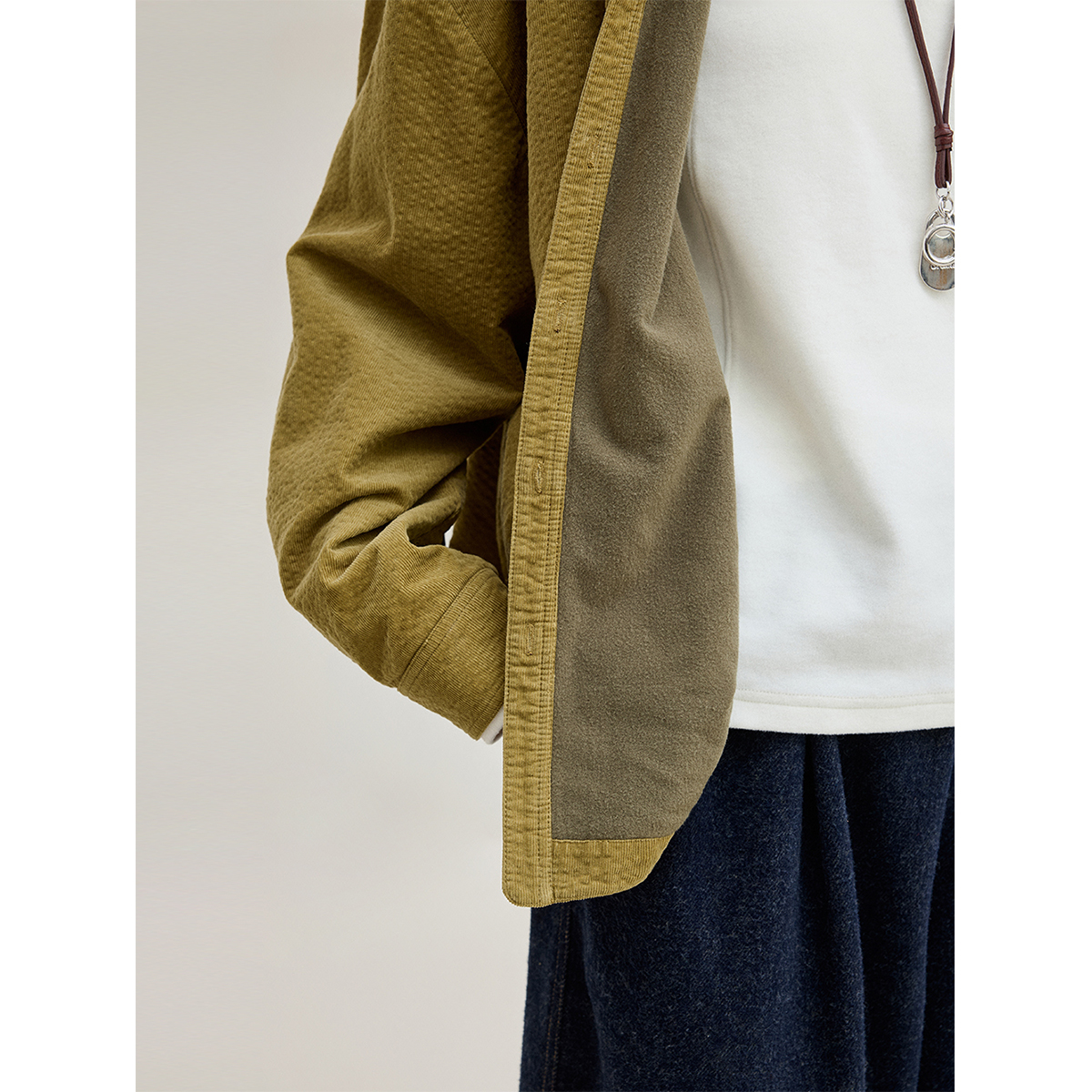 麻霖复古文艺棉混纺细坑条泡泡皱灯芯绒小翻领加绒柔软亲肤衬衫