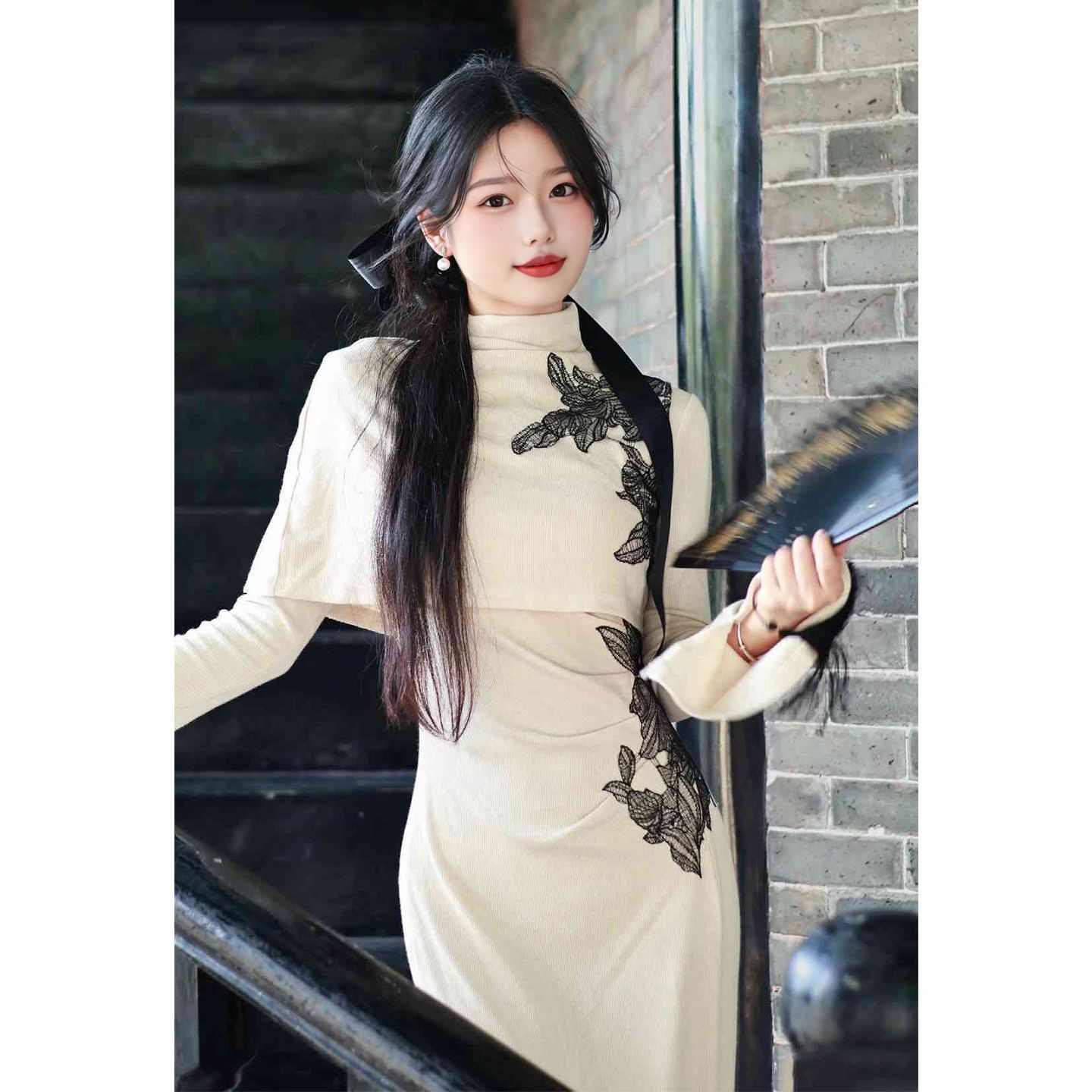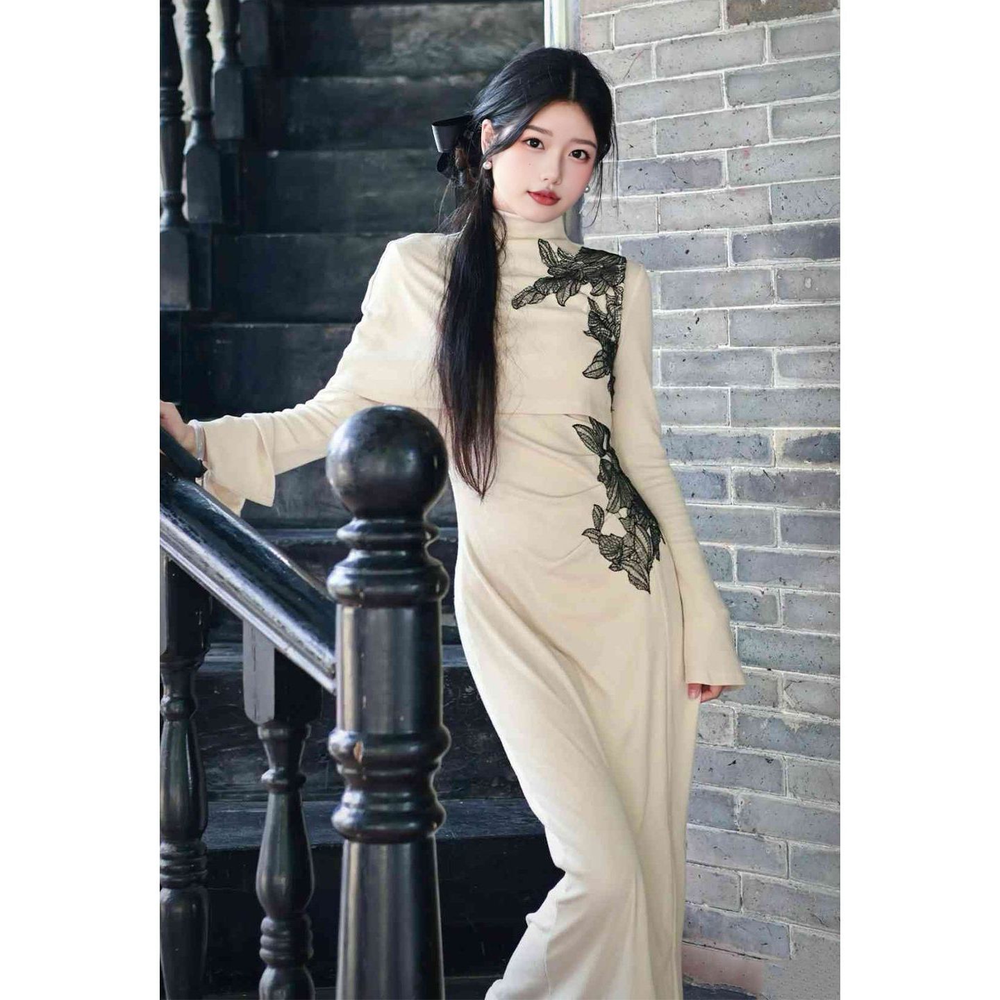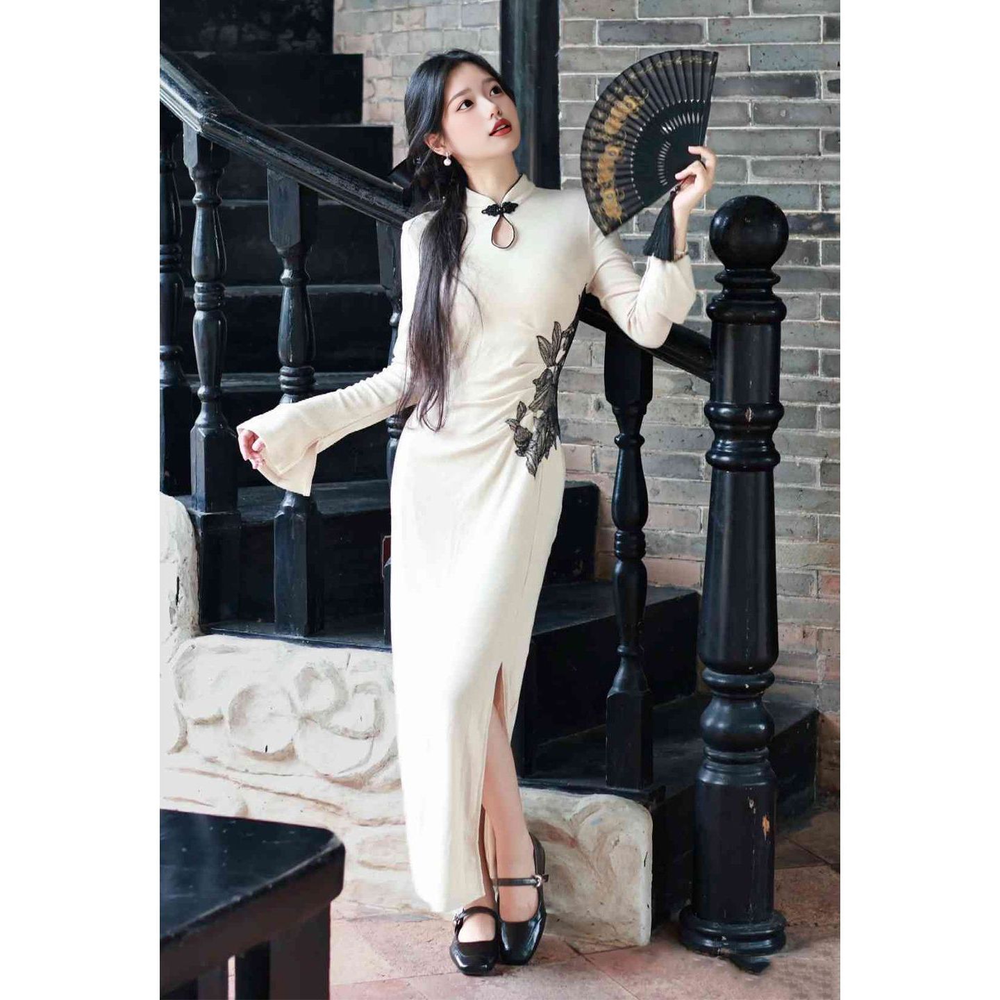 细语岁月 灰色蝴蝶结盘扣旗袍连衣裙开衫 秋季 新中式 女 新款 乔拉