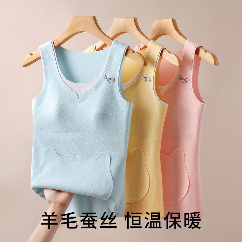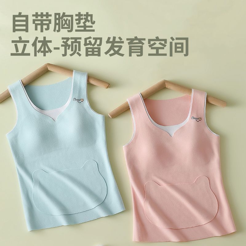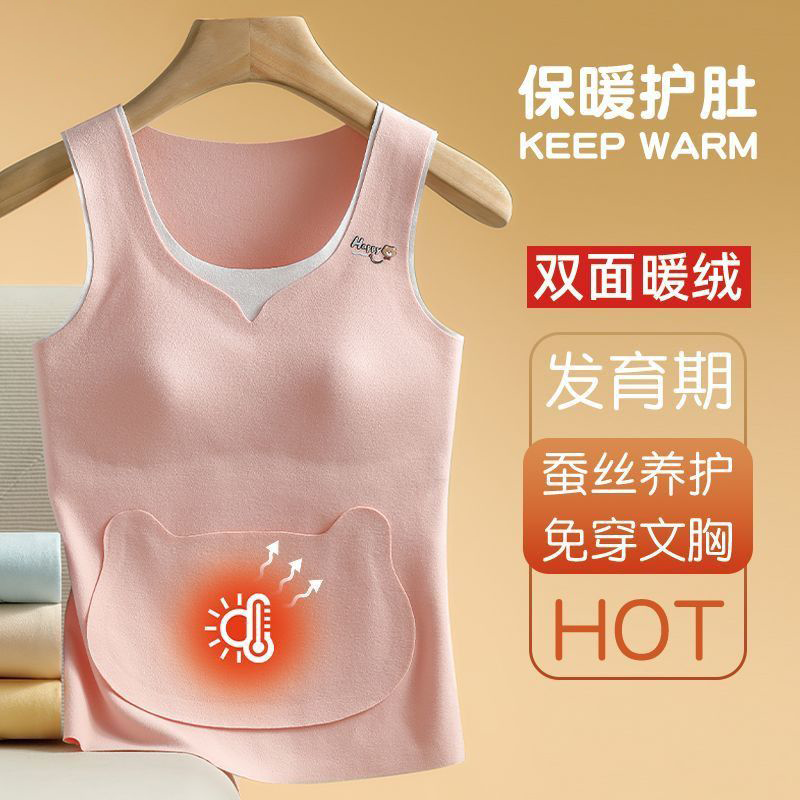 女童德绒保暖上衣加绒加厚背心发育期学生初中自带胸垫内衣秋冬款