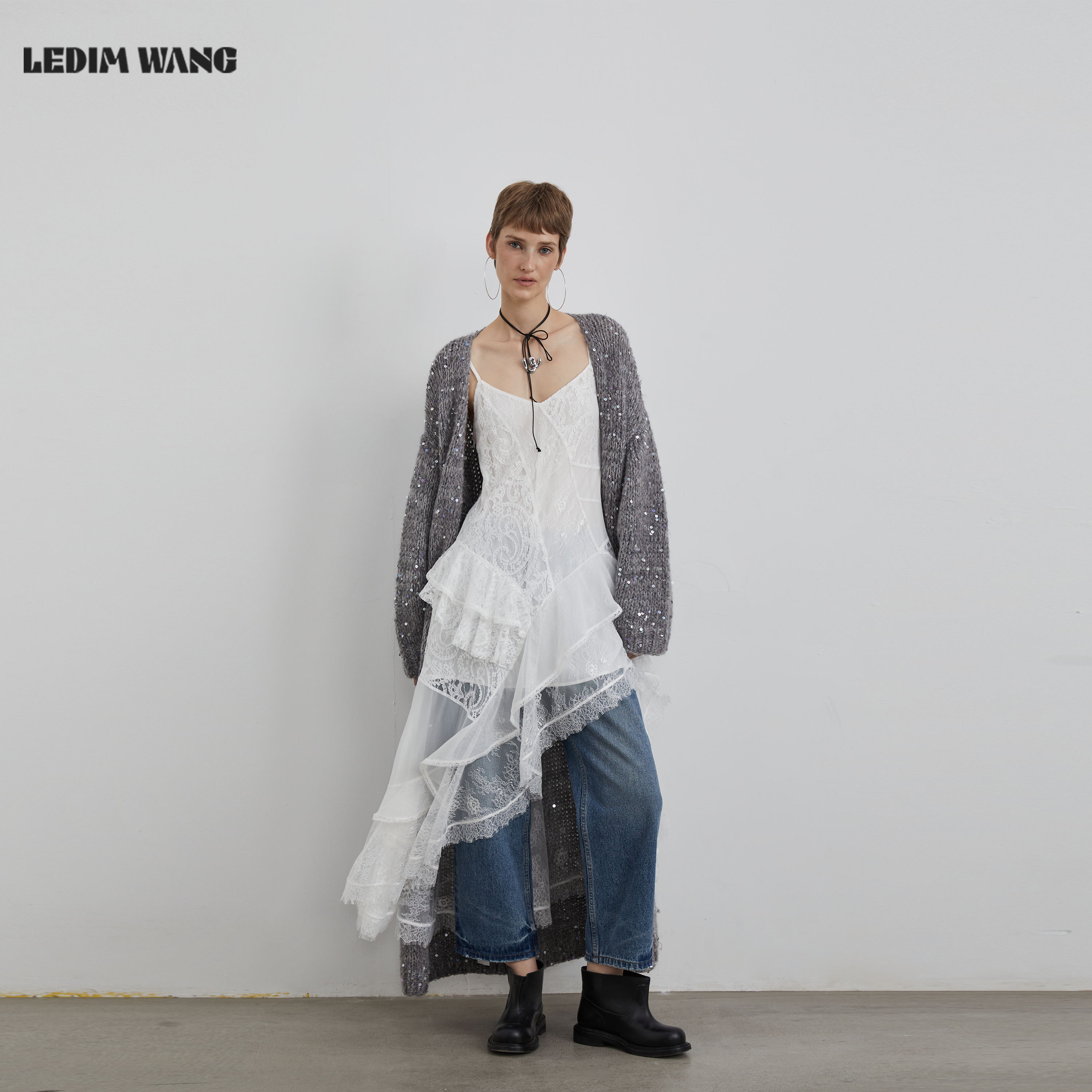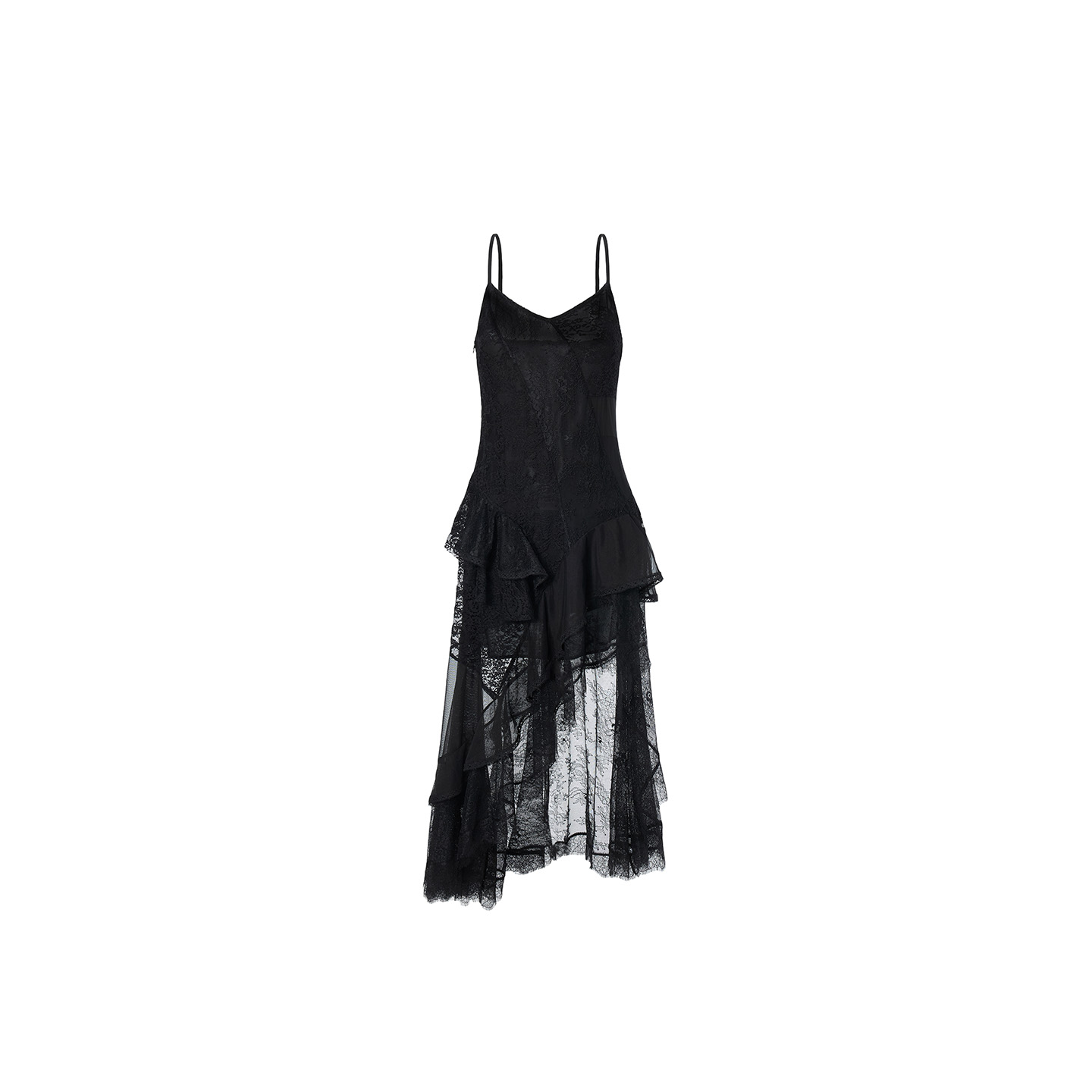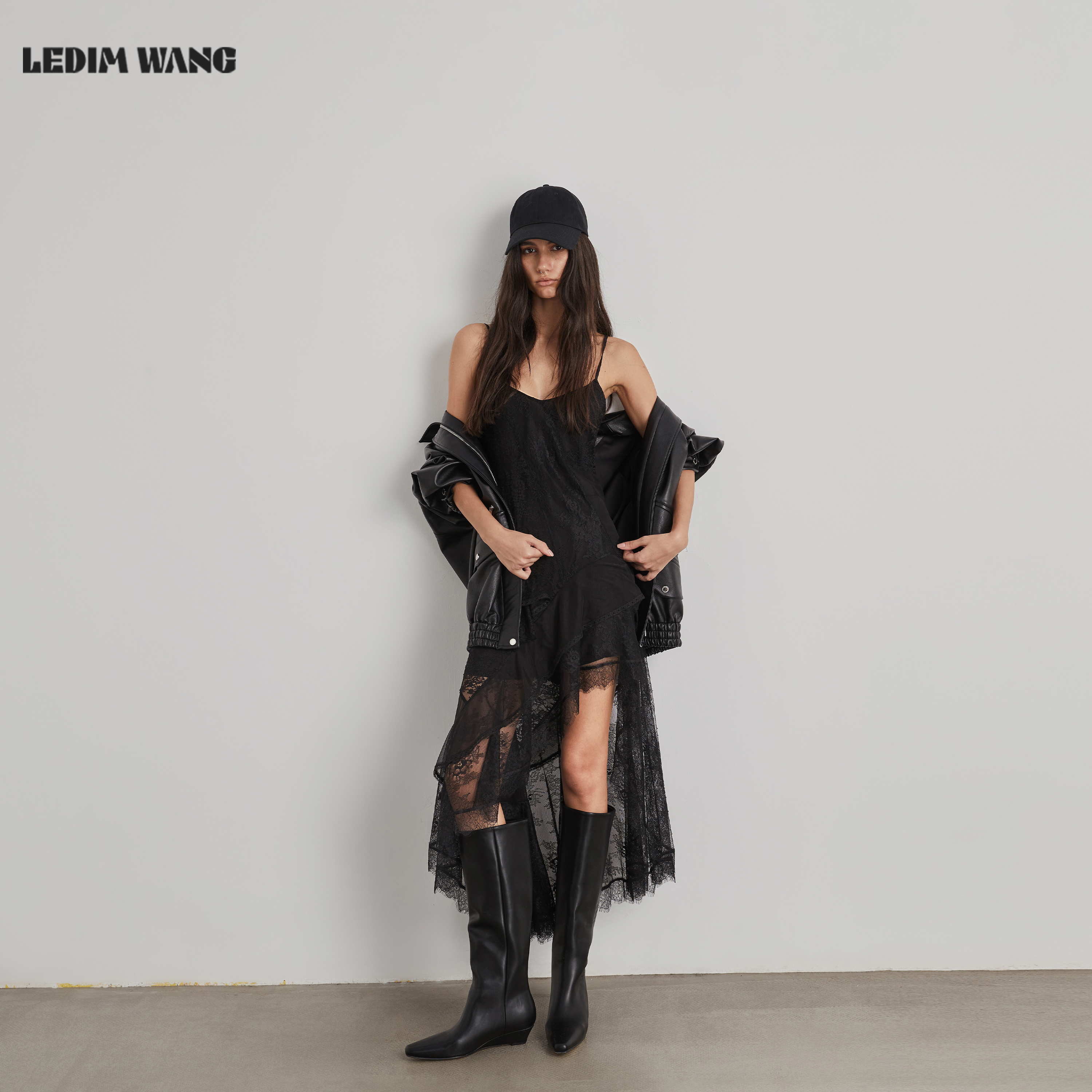 新款 拼贴吊带蕾丝连衣裙女25冬季 黑色不规则长裙 WANG白标 LEDIM